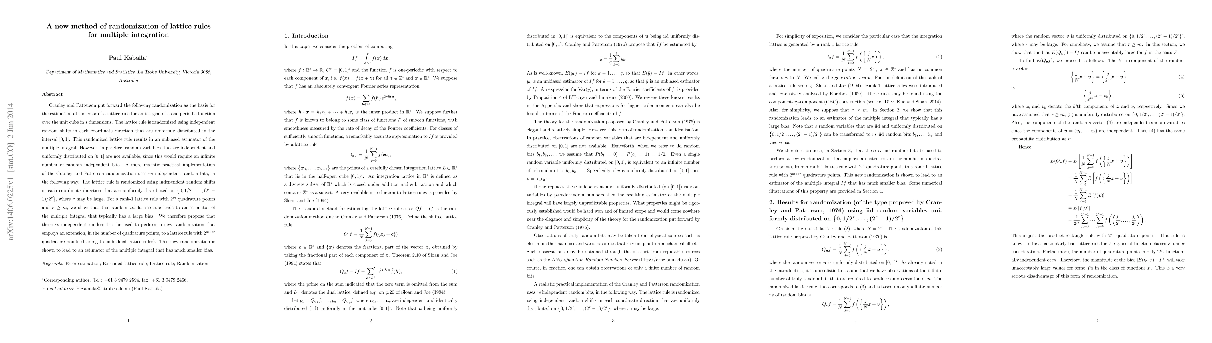 Cranley and Patterson put forward the following randomization as the basis for the estimation of the error of a lattice rule for an integral of a one-periodic function over the unit cube in s dimensions. The lattice rule is randomized using independent random shifts in each coordinate direction that are uniformly distributed in the interval [0,1]. This randomized lattice rule results in an unbiased estimator of the multiple integral. However, in practice, random variables that are independent and uniformly distributed on [0,1] are not available, since this would require an infinite number of random independent bits. A more realistic practical implementation of the Cranley and Patterson randomization uses rs independent random bits, in the following way. The lattice rule is randomized using independent random shifts in each coordinate direction that are uniformly distributed on {0, 1/2^r, ... ,(2^r-1)/2^r}, where r may be large. For a rank-1 lattice rule with 2^m quadrature points and r >= m, we show that this randomized lattice rule leads to an estimator of the multiple integral that typically has a large bias. We therefore propose that these rs independent random bits be used to perform a new randomization that employs an extension, in the number of quadrature points, to a lattice rule with 2^(m+sr) quadrature points (leading to embedded lattice rules).This new randomization is shown to lead to an estimator of the multiple integral that has much smaller bias.