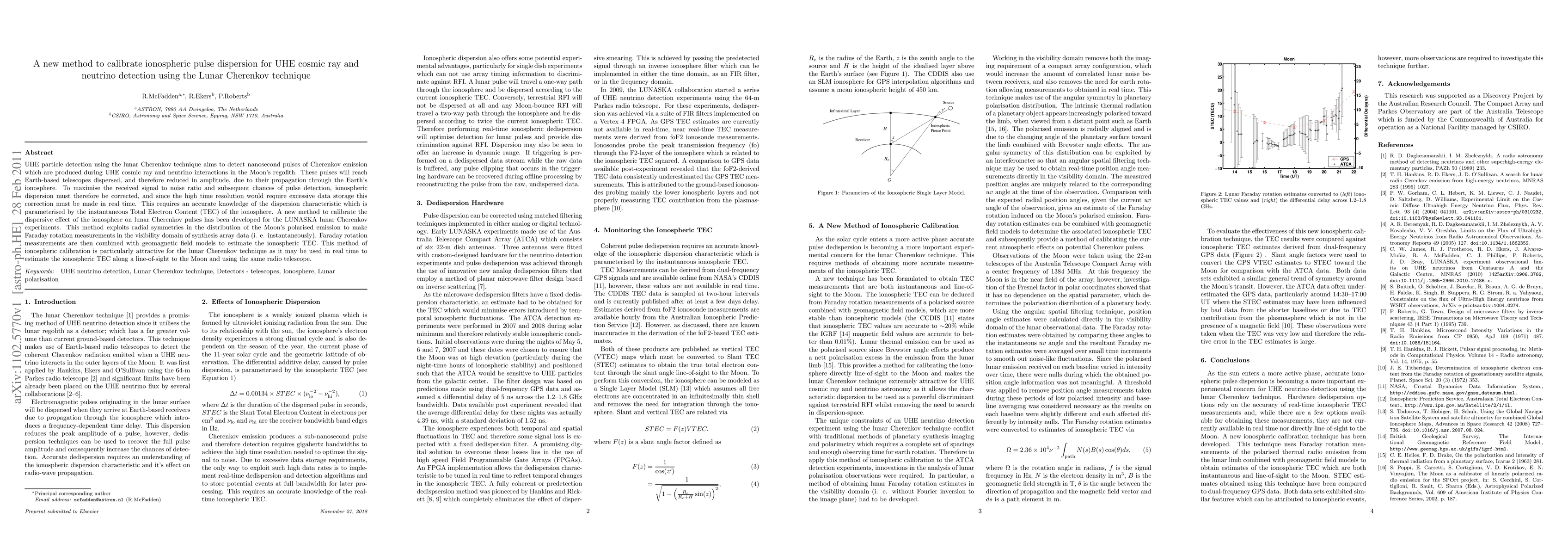 UHE particle detection using the lunar Cherenkov technique aims to detect nanosecond pulses of Cherenkov emission which are produced during UHE cosmic ray and neutrino interactions in the Moon's regolith. These pulses will reach Earth-based telescopes dispersed, and therefore reduced in amplitude, due to their propagation through the Earth's ionosphere. To maximise the received signal to noise ratio and subsequent chances of pulse detection, ionospheric dispersion must therefore be corrected, and since the high time resolution would require excessive data storage this correction must be made in real time. This requires an accurate knowledge of the dispersion characteristic which is parameterised by the instantaneous Total Electron Content (TEC) of the ionosphere. A new method to calibrate the dispersive effect of the ionosphere on lunar Cherenkov pulses has been developed for the LUNASKA lunar Cherenkov experiments. This method exploits radial symmetries in the distribution of the Moon's polarised emission to make Faraday rotation measurements in the visibility domain of synthesis array data (i. e. instantaneously). Faraday rotation measurements are then combined with geomagnetic field models to estimate the ionospheric TEC. This method of ionospheric calibration is particularly attractive for the lunar Cherenkov technique as it may be used in real time to estimate the ionospheric TEC along a line-of-sight to the Moon and using the same radio telescope.