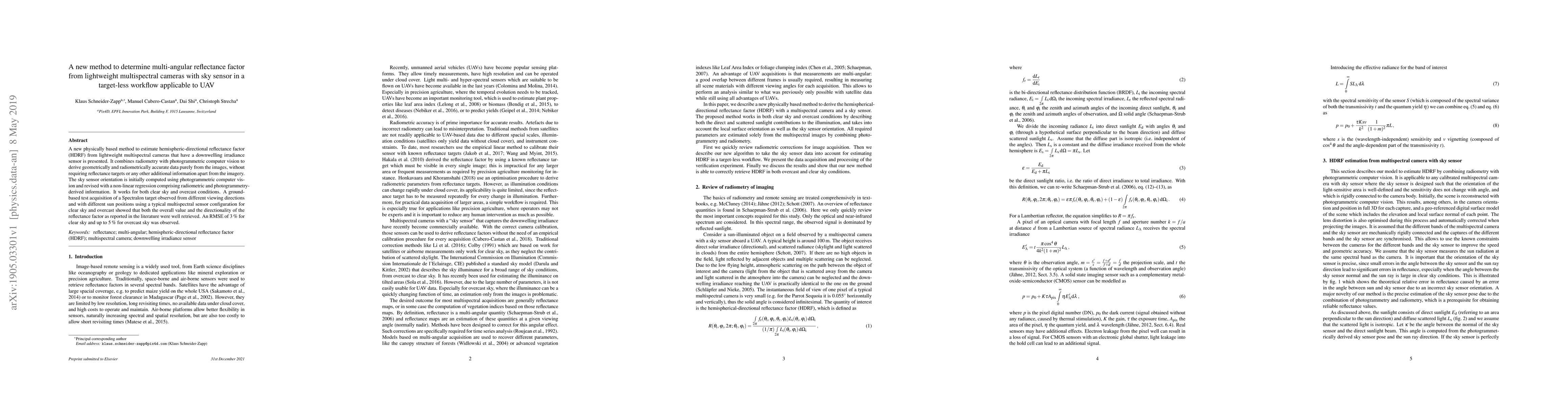 A new physically based method to estimate hemispheric-directional reflectance factor (HDRF) from lightweight multispectral cameras that have a downwelling irradiance sensor is presented. It combines radiometry with photogrammetric computer vision to derive geometrically and radiometrically accurate data purely from the images, without requiring reflectance targets or any other additional information apart from the imagery. The sky sensor orientation is initially computed using photogrammetric computer vision and revised with a non-linear regression comprising radiometric and photogrammetry-derived information. It works for both clear sky and overcast conditions. A ground-based test acquisition of a Spectralon target observed from different viewing directions and with different sun positions using a typical multispectral sensor configuration for clear sky and overcast showed that both the overall value and the directionality of the reflectance factor as reported in the literature were well retrieved. An RMSE of 3% for clear sky and up to 5% for overcast sky was observed.