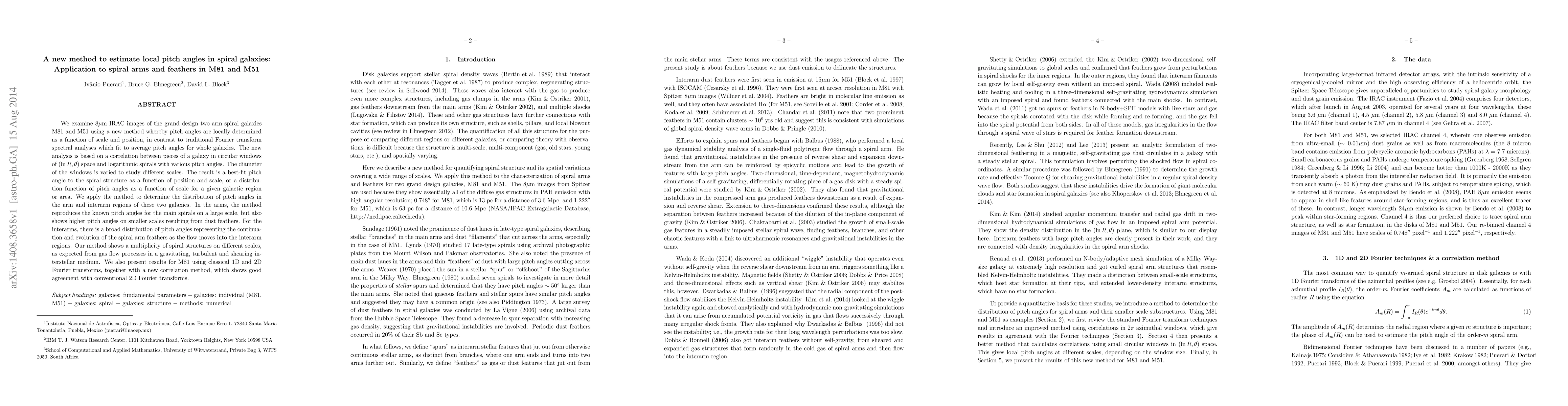 This paper introduces a novel method to locally estimate pitch angles in spiral galaxies M81 and M51 using $8\mu$m IRAC images, providing a distribution of pitch angles that varies with scale and position. The method reveals higher pitch angles on smaller scales due to dust feathers, and a broad pitch angle distribution in interarm regions, indicating complex spiral structures influenced by interstellar medium dynamics.