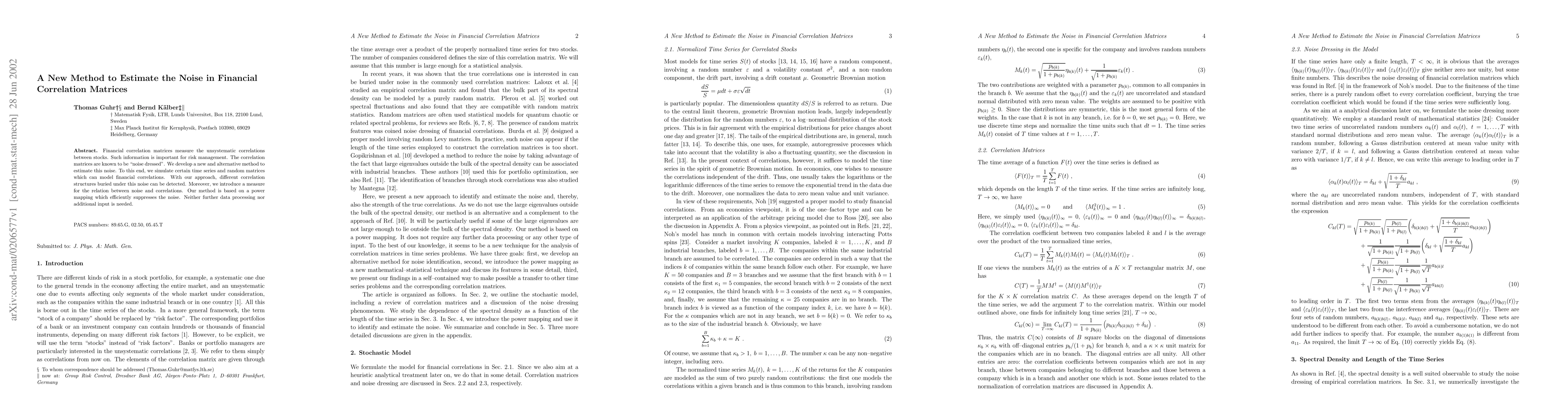 This paper introduces a novel method for estimating noise in financial correlation matrices, which are crucial for risk management. The proposed approach uses power mapping to efficiently suppress noise, allowing for the detection of underlying correlation structures without additional data processing or inputs.
