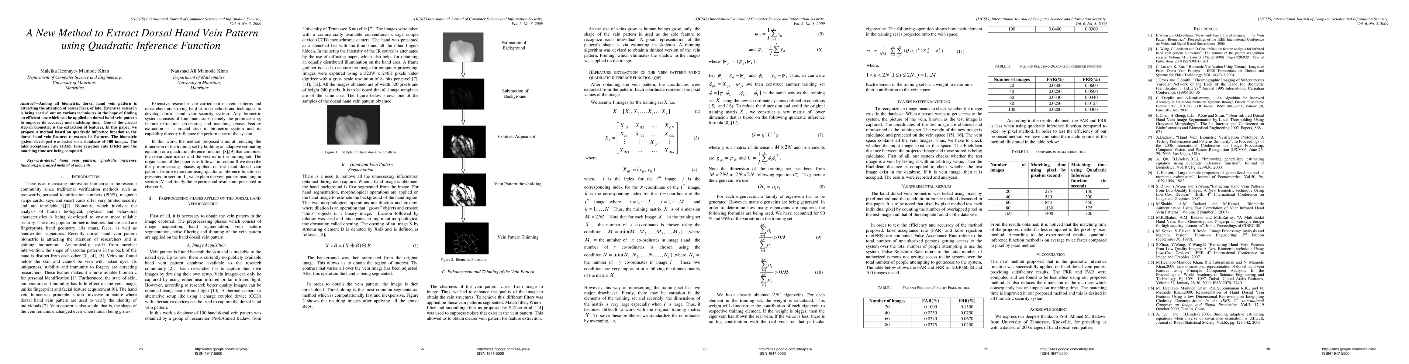 This paper proposes a new method using quadratic inference function for extracting dorsal hand vein patterns, aiming to improve biometric accuracy and matching time. The method was tested on 100 images, evaluating its performance in terms of false acceptance rate, false rejection rate, and matching time.