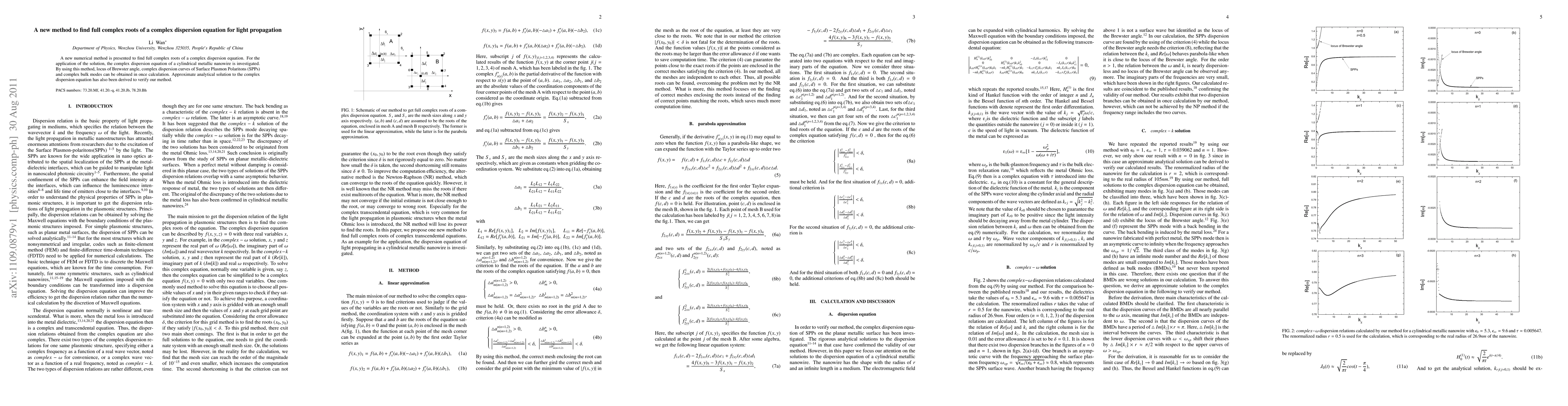 A new numerical method is presented to find full complex roots of a complex dispersion equation. For the application of the solution, the complex dispersion equation of a cylindrical metallic nanowire is investigated. By using this method, locus of Brewster angle, complex dispersion curves of Surface Plasmon Polaritons (SPPs) and complex bulk modes can be obtained in once calculation. Approximate analytical solution to the complex dispersion equation has also been derived to verify our method.