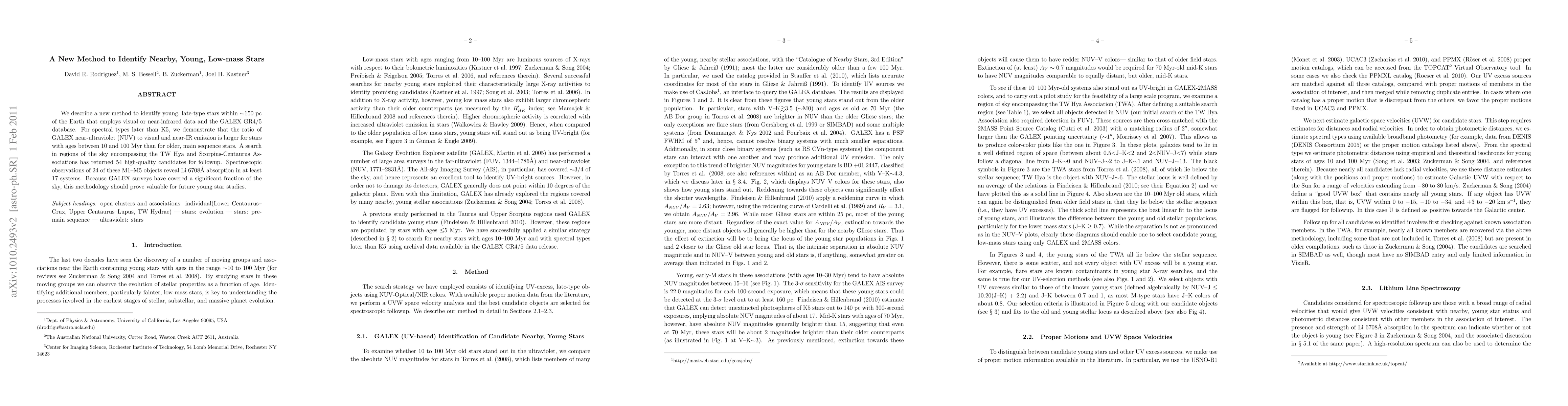 We describe a new method to identify young, late-type stars within ~150 pc of the Earth that employs visual or near-infrared data and the GALEX GR4/5 database. For spectral types later than K5, we demonstrate that the ratio of GALEX near-ultraviolet (NUV) to visual and near-IR emission is larger for stars with ages between 10 and 100 Myr than for older, main sequence stars. A search in regions of the sky encompassing the TW Hya and Scorpius-Centaurus Associations has returned 54 high-quality candidates for followup. Spectroscopic observations of 24 of these M1-M5 objects reveal Li 6708 angstrom absorption in at least 17 systems. Because GALEX surveys have covered a significant fraction of the sky, this methodology should prove valuable for future young star studies.