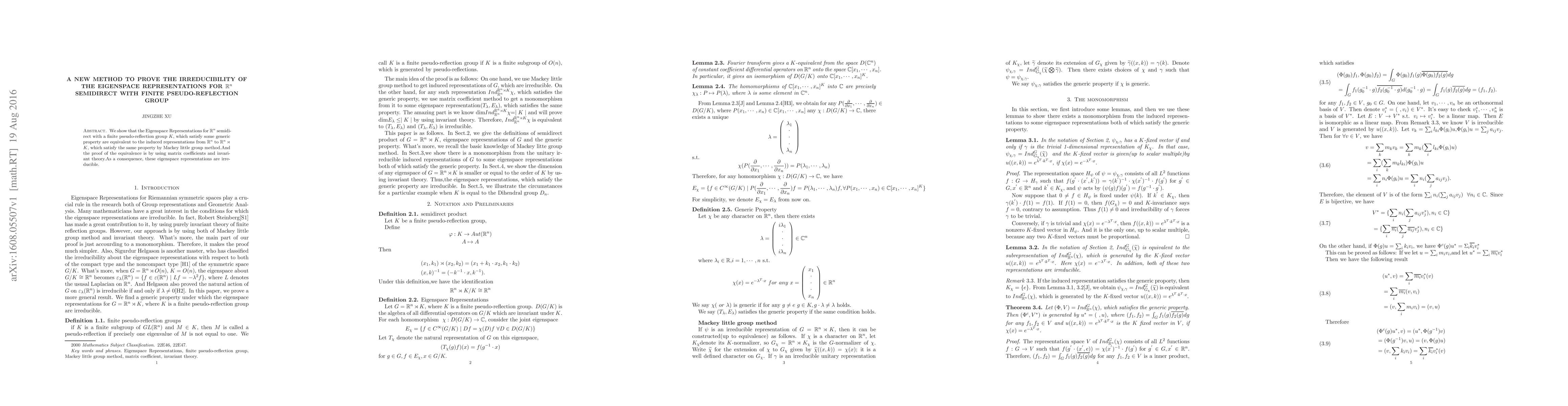 This paper introduces a new method to prove the irreducibility of eigenspace representations for $\mathbb{R}^{n}$ semidirect with a finite pseudo-reflection group $K$, using the Mackey little group method, matrix coefficients, and invariant theory to establish their equivalence and irreducibility.
