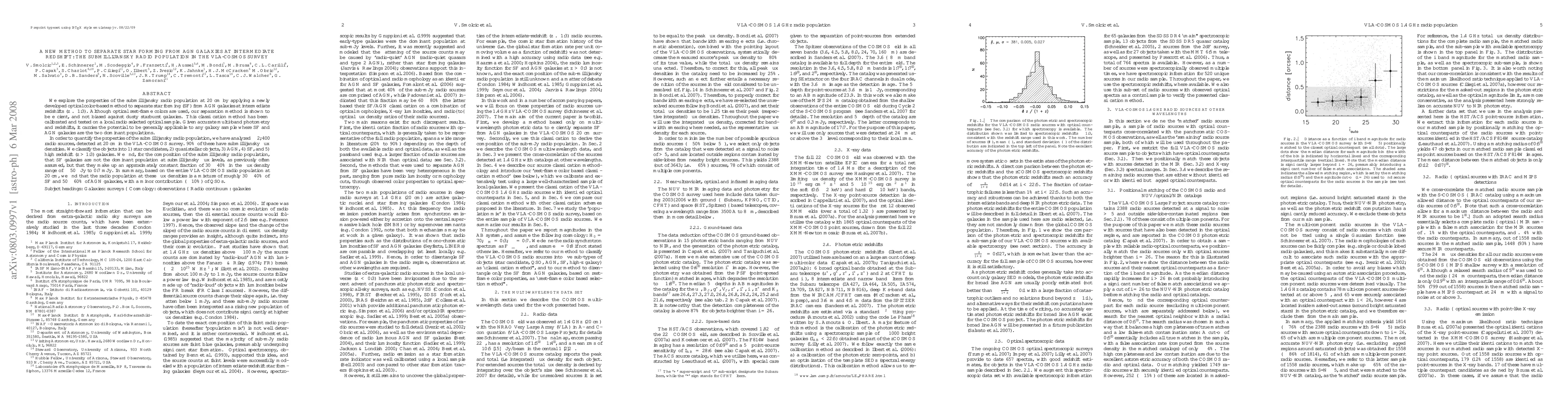 This research introduces a new method using optical colors to distinguish between star-forming and Active Galactic Nucleus (AGN) galaxies at intermediate redshifts. Applied to the VLA-COSMOS 20 cm survey, it reveals that star-forming galaxies constitute 30-40% of submillijansky radio sources, contradicting previous assumptions that they were the dominant population. The study concludes that the radio population at these flux densities is predominantly a mix of 30-40% star-forming and 50-60% AGN galaxies, with a minor 10% contribution of QSOs.