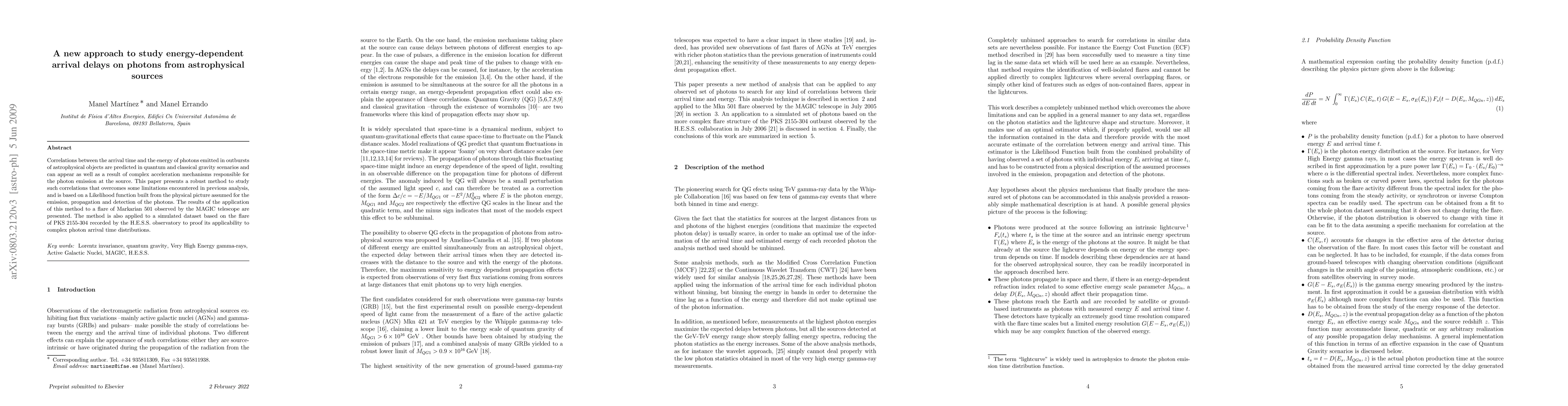 Correlations between the arrival time and the energy of photons emitted in outbursts of astrophysical objects are predicted in quantum and classical gravity scenarios and can appear as well as a result of complex acceleration mechanisms responsible for the photon emission at the source. This paper presents a robust method to study such correlations that overcomes some limitations encountered in previous analysis, and is based on a Likelihood function built from the physical picture assumed for the emission, propagation and detection of the photons. The results of the application of this method to a flare of Markarian 501 observed by the MAGIC telescope are presented. The method is also applied to a simulated dataset based on the flare of PKS 2155-304 recorded by the H.E.S.S. observatory to proof its applicability to complex photon arrival time distributions.
