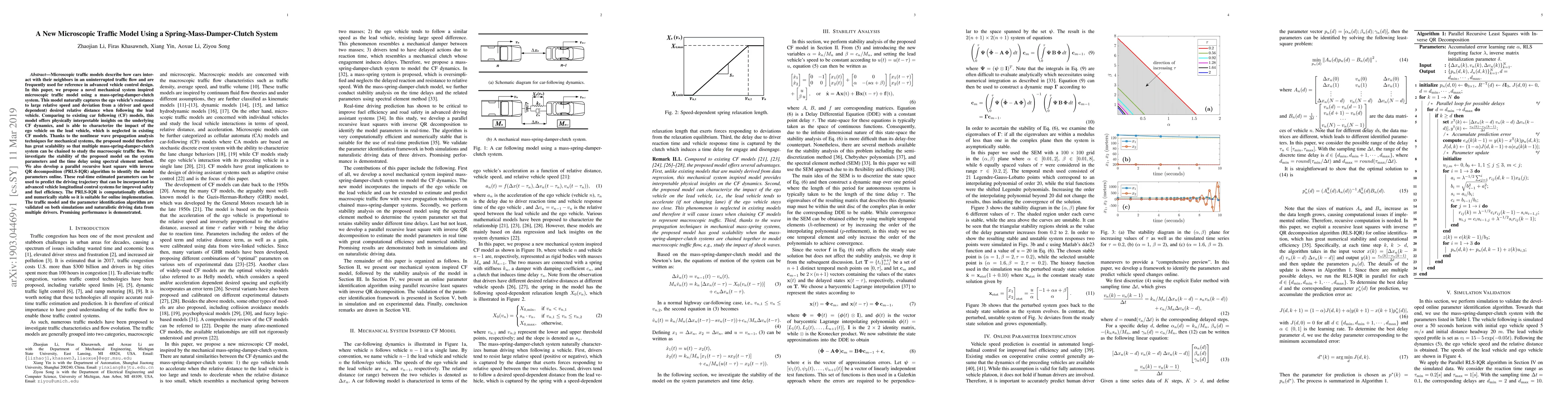 Microscopic traffic models describe how cars interact with their neighbors in an uninterrupted traffic flow and are frequently used for reference in advanced vehicle control design. In this paper, we propose a novel mechanical system inspired microscopic traffic model using a mass-spring-damper-clutch system. This model naturally captures the ego vehicle's resistance to large relative speed and deviation from a (driver and speed dependent) desired relative distance when following the lead vehicle. Comparing to existing car following (CF) models, this model offers physically interpretable insights on the underlying CF dynamics, and is able to characterize the impact of the ego vehicle on the lead vehicle, which is neglected in existing CF models. Thanks to the nonlinear wave propagation analysis techniques for mechanical systems, the proposed model therefore has great scalability so that multiple mass-spring-damper-clutch system can be chained to study the macroscopic traffic flow. We investigate the stability of the proposed model on the system parameters and the time delay using spectral element method. We also develop a parallel recursive least square with inverse QR decomposition (PRLS-IQR) algorithm to identify the model parameters online. These real-time estimated parameters can be used to predict the driving trajectory that can be incorporated in advanced vehicle longitudinal control systems for improved safety and fuel efficiency. The PRLS-IQR is computationally efficient and numerically stable so it is suitable for online implementation. The traffic model and the parameter identification algorithm are validated on both simulations and naturalistic driving data from multiple drivers. Promising performance is demonstrated.