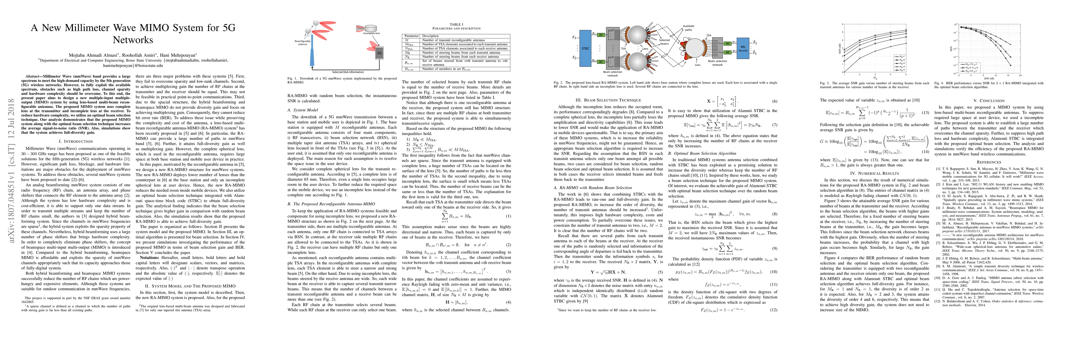 This paper proposes a new millimeter wave MIMO system for 5G networks using lens-based multi-beam reconfigurable antennas to address high path loss and channel sparsity. The system employs optimal beam selection to reduce hardware complexity, resulting in improved average SNR and full-diversity gain.