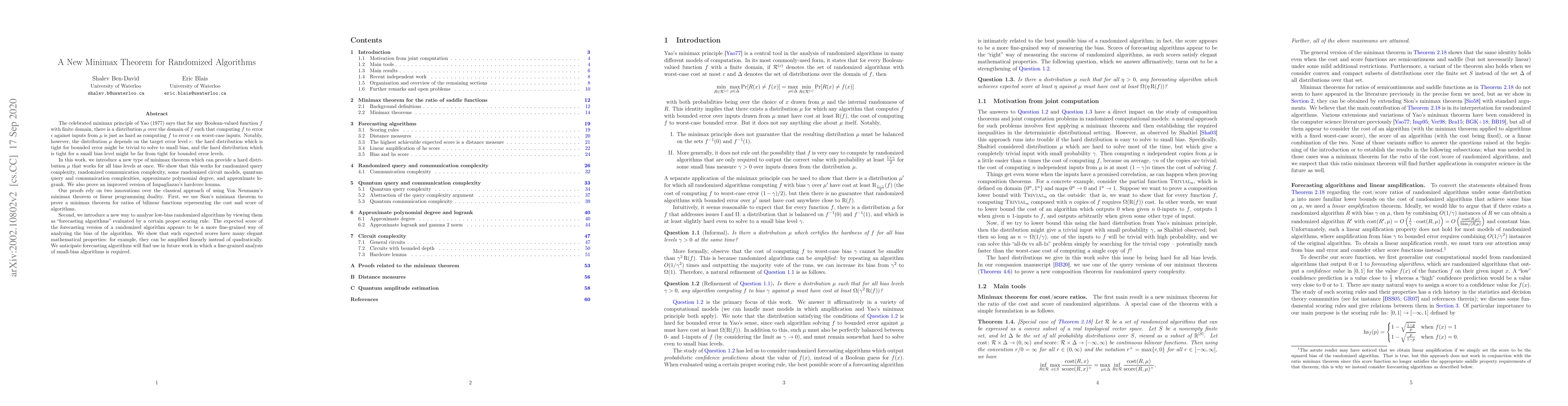 The celebrated minimax principle of Yao (1977) says that for any Boolean-valued function $f$ with finite domain, there is a distribution $\mu$ over the domain of $f$ such that computing $f$ to error $\epsilon$ against inputs from $\mu$ is just as hard as computing $f$ to error $\epsilon$ on worst-case inputs. Notably, however, the distribution $\mu$ depends on the target error level $\epsilon$: the hard distribution which is tight for bounded error might be trivial to solve to small bias, and the hard distribution which is tight for a small bias level might be far from tight for bounded error levels. In this work, we introduce a new type of minimax theorem which can provide a hard distribution $\mu$ that works for all bias levels at once. We show that this works for randomized query complexity, randomized communication complexity, some randomized circuit models, quantum query and communication complexities, approximate polynomial degree, and approximate logrank. We also prove an improved version of Impagliazzo's hardcore lemma. Our proofs rely on two innovations over the classical approach of using Von Neumann's minimax theorem or linear programming duality. First, we use Sion's minimax theorem to prove a minimax theorem for ratios of bilinear functions representing the cost and score of algorithms. Second, we introduce a new way to analyze low-bias randomized algorithms by viewing them as "forecasting algorithms" evaluated by a proper scoring rule. The expected score of the forecasting version of a randomized algorithm appears to be a more fine-grained way of analyzing the bias of the algorithm. We show that such expected scores have many elegant mathematical properties: for example, they can be amplified linearly instead of quadratically. We anticipate forecasting algorithms will find use in future work in which a fine-grained analysis of small-bias algorithms is required.