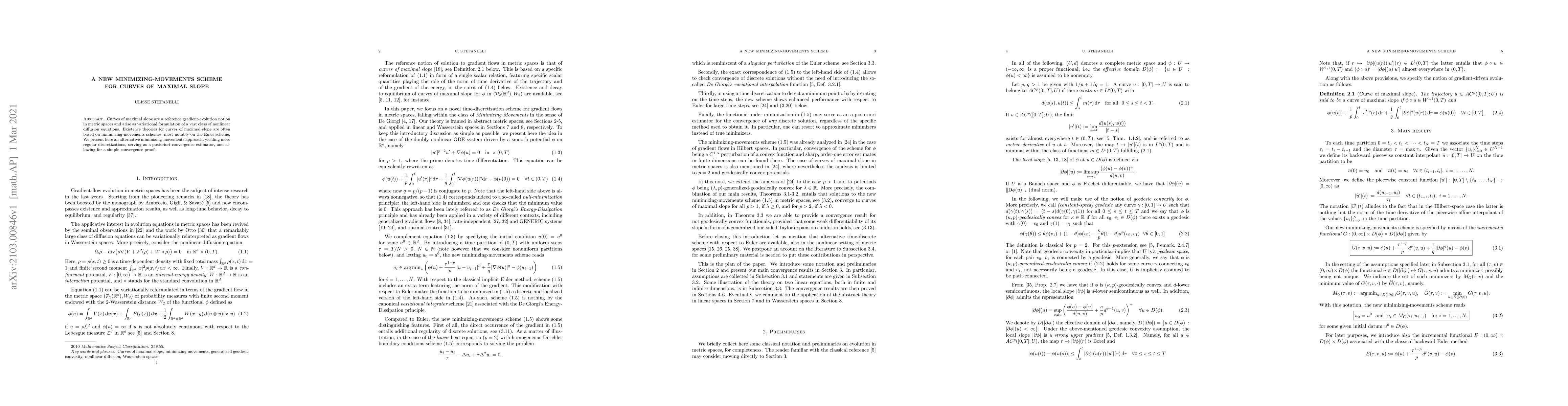 Researchers develop a new minimizing-movements scheme to solve curves of maximal slope in metric spaces, offering more regular discretizations and facilitating convergence proof.