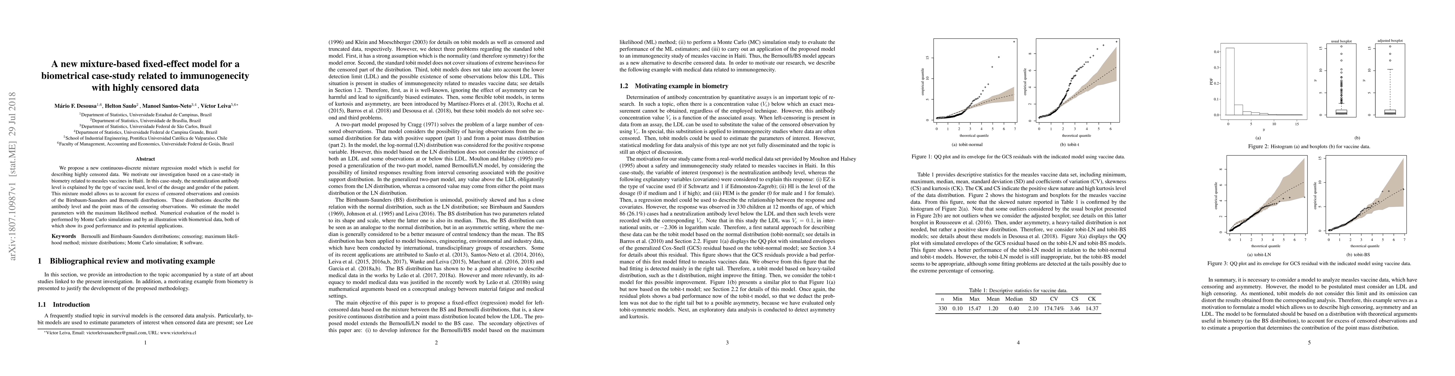 We propose a new continuous-discrete mixture regression model which is useful for describing highly censored data. We motivate our investigation based on a case-study in biometry related to measles vaccines in Haiti. In this case-study, the neutralization antibody level is explained by the type of vaccine used, level of the dosage and gender of the patient. This mixture model allows us to account for excess of censored observations and consists of the Birnbaum-Saunders and Bernoulli distributions. These distributions describe the antibody level and the point mass of the censoring observations. We estimate the model parameters with the maximum likelihood method. Numerical evaluation of the model is performed by Monte Carlo simulations and by an illustration with biometrical data, both of which show its good performance and its potential applications.