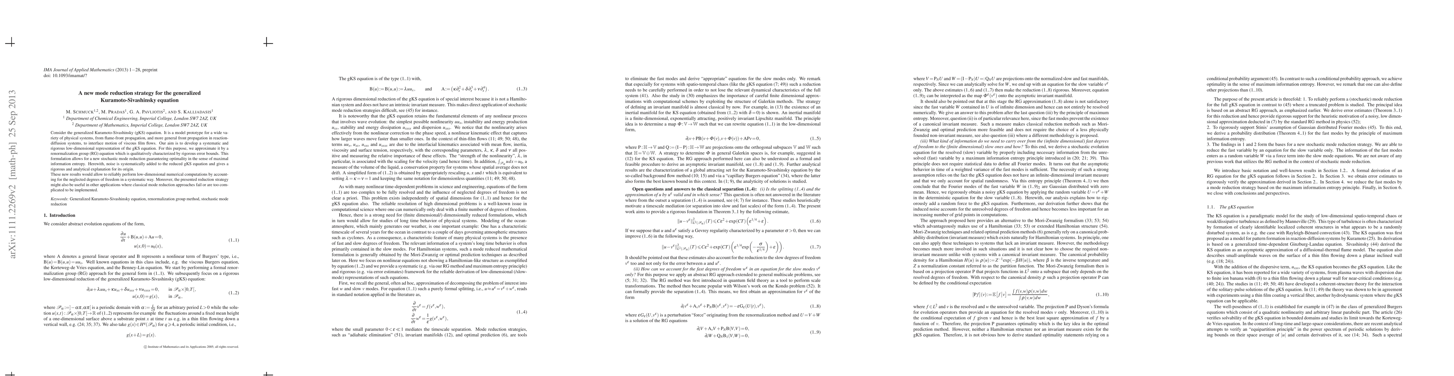 Consider the generalized Kuramoto-Sivashinsky (gKS) equation. It is a model prototype for a wide variety of physical systems, from flame-front propagation, and more general front propagation in reaction-diffusion systems, to interface motion of viscous film flows. Our aim is to develop a systematic and rigorous low-dimensional representation of the gKS equation. For this purpose, we approximate it by a renormalization group (RG) equation which is qualitatively characterized by rigorous error bounds. This formulation allows for a new stochastic mode reduction guaranteeing optimality in the sense of maximal information entropy. Herewith, noise is systematically added to the reduced gKS equation and gives a rigorous and analytical explanation for its origin. These new results would allow to reliably perform low-dimensional numerical computations by accounting for the neglected degrees of freedom in a systematic way. Moreover, the presented reduction strategy might also be useful in other applications where classical mode reduction approaches fail or are too complicated to be implemented.