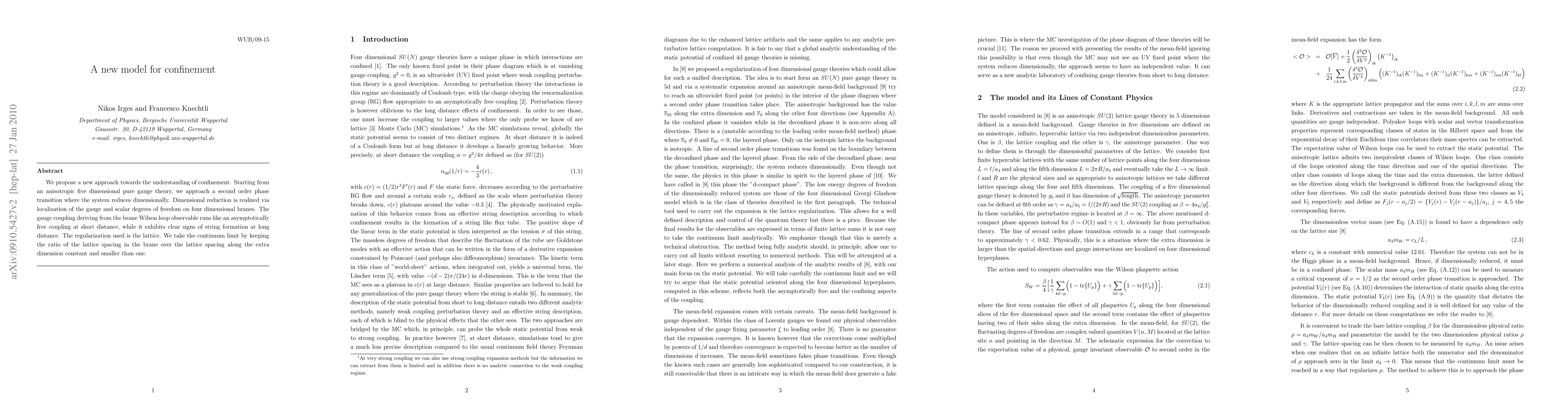 We propose a new approach towards the understanding of confinement. Starting from an anisotropic five dimensional pure gauge theory, we approach a second order phase transition where the system reduces dimensionally. Dimensional reduction is realized via localization of the gauge and scalar degrees of freedom on four dimensional branes. The gauge coupling deriving from the brane Wilson loop observable runs like an asymptotically free coupling at short distance, while it exhibits clear signs of string formation at long distance. The regularization used is the lattice. We take the continuum limit by keeping the ratio of the lattice spacing in the brane over the lattice spacing along the extra dimension constant and smaller than one.