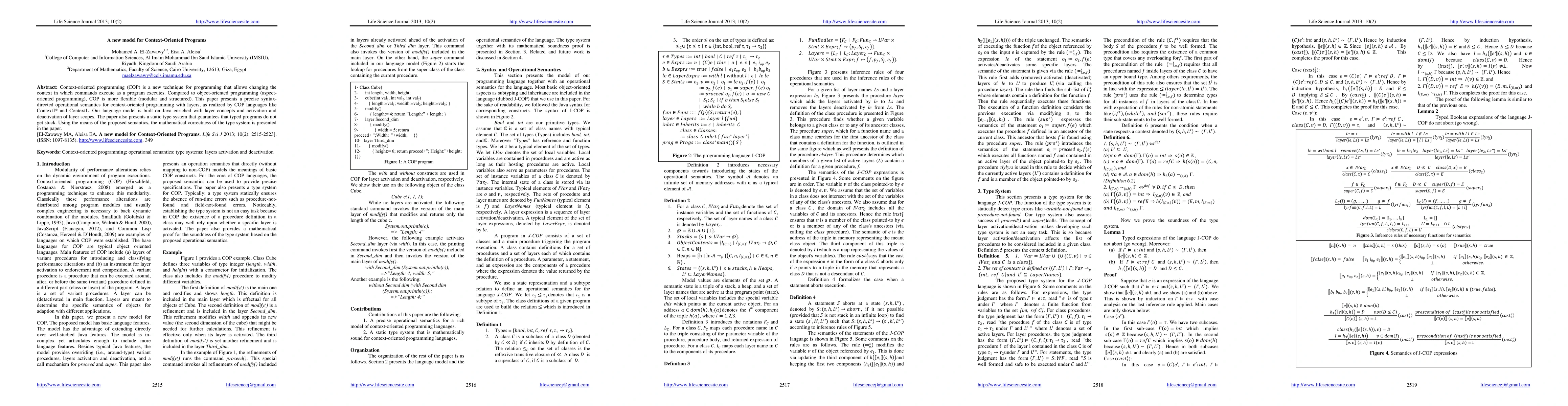 This paper introduces a new model for context-oriented programming (COP) that enhances flexibility and modularity compared to object-oriented programming. It presents a syntax-directed operational semantics and a static type system for COP languages like ContextJ* and ContextL, ensuring program correctness and preventing runtime errors.