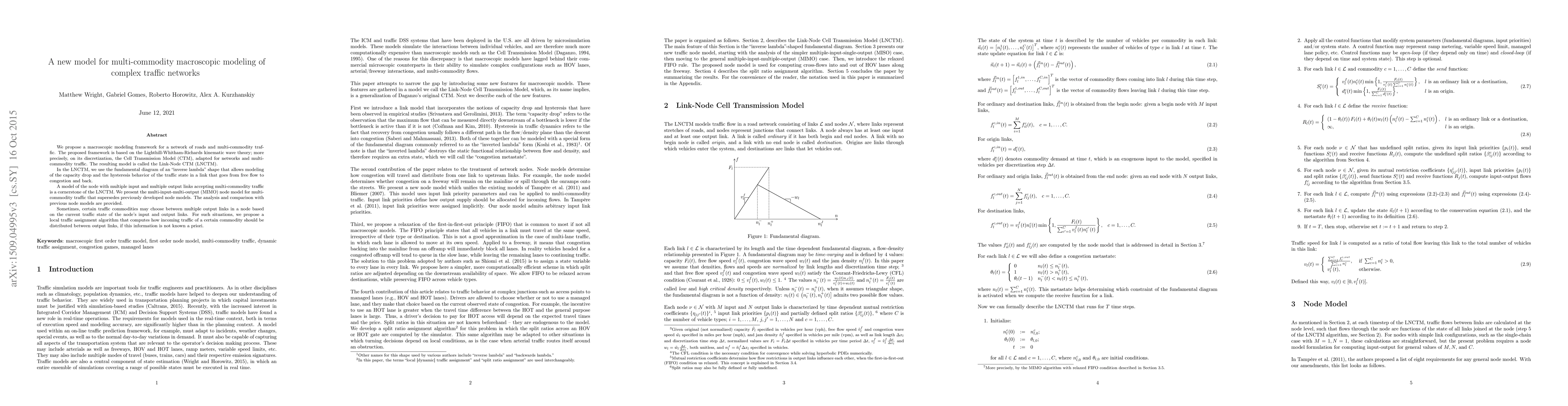 This paper introduces the Link-Node Cell Transmission Model (LNCTM) for multi-commodity traffic in complex road networks, based on the Cell Transmission Model and the "inverse lambda" fundamental diagram. It also presents a new multi-input-multi-output (MIMO) node model for handling multi-commodity traffic and proposes a local traffic assignment algorithm for distributing traffic between output links based on current traffic conditions.