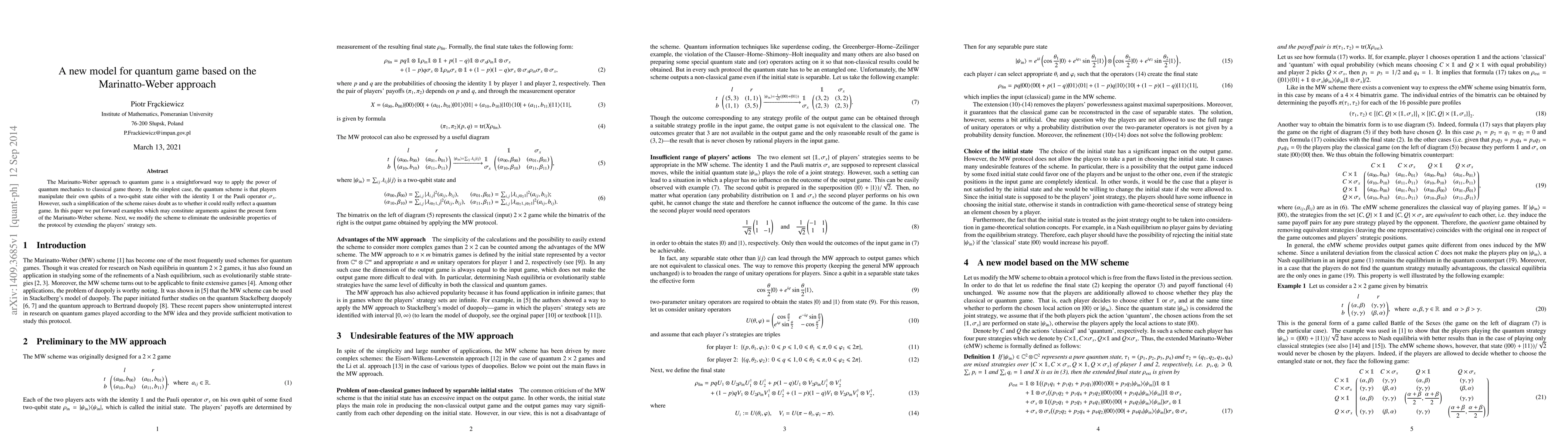 This paper critiques the existing Marinatto-Weber quantum game model, arguing it lacks realism. It proposes modifications to the scheme by expanding players' strategy sets to better reflect quantum game dynamics.