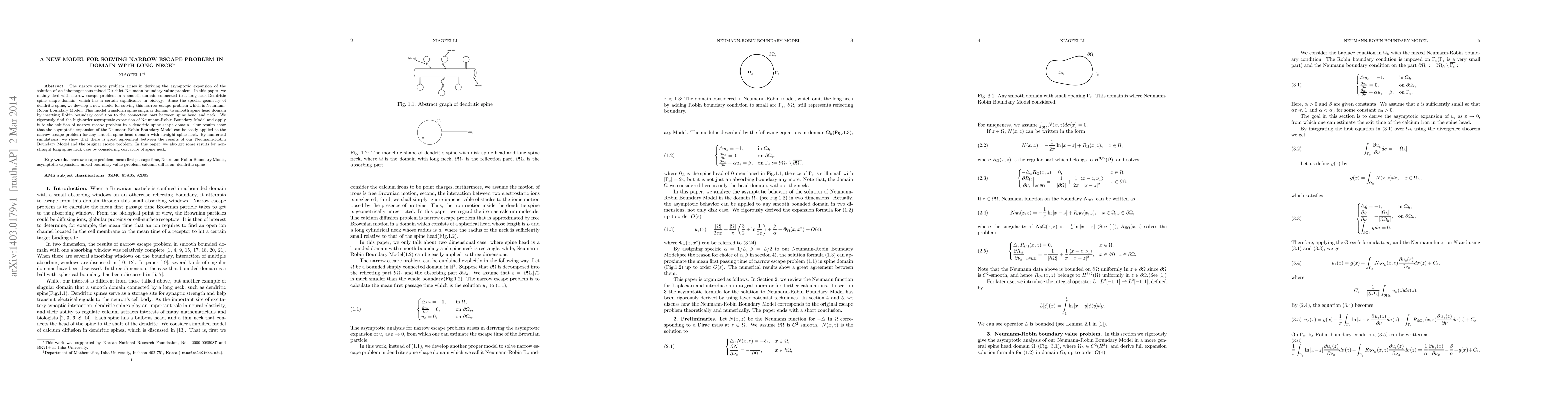 The narrow escape problem arises in deriving the asymptotic expansion of the solution of an inhomogeneous mixed Dirichlet-Neumann boundary value problem. In this paper, we mainly deal with narrow escape problem in a smooth domain connected to a long neck-Dendritic spine shape domain, which has a certain significance in biology. Since the special geometry of dendritic spine, we develop a new model for solving this narrow escape problem which is Neumann-Robin Boundary Model. This model transform spine singular domain to smooth spine head domain by inserting Robin boundary condition to the connection part between spine head and neck. We rigorously find the high-order asymptotic expansion of Neumann-Robin Boundary Model and apply it to the solution of narrow escape problem in a dendritic spine shape domain. Our results show that the asymptotic expansion of the Neumann-Robin Boundary Model can be easily applied to the narrow escape problem for any smooth spine head domain with straight spine neck. By numerical simulations, we show that there is great agreement between the results of our Neumann-Robin Boundary Model and the original escape problem. In this paper, we also get some results for non-straight long spine neck case by considering curvature of spine neck.