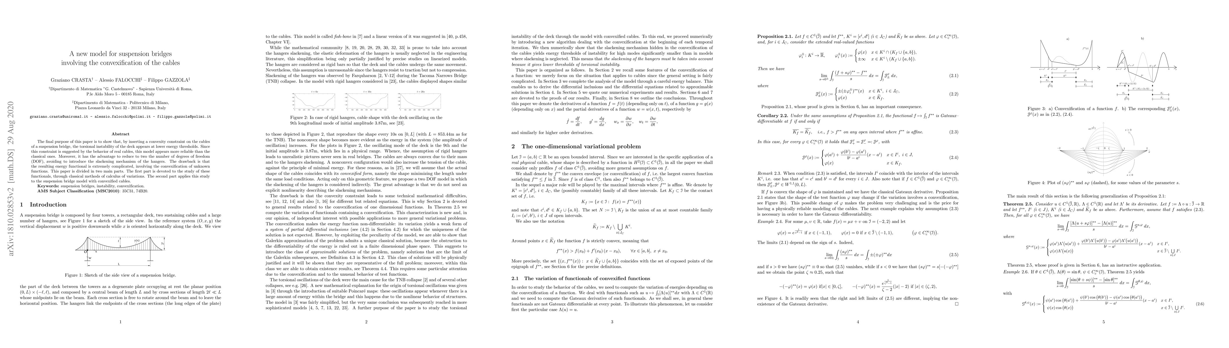 The final purpose of this paper is to show that, by inserting a convexity constraint on the cables of a suspension bridge, the torsional instability of the deck appears at lower energy thresholds. Since this constraint is suggested by the behavior of real cables, this model appears more reliable than the classical ones. Moreover, it has the advantage to reduce to two the number of degrees of freedom (DOF), avoiding to introduce the slackening mechanism of the hangers. The drawback is that the resulting energy functional is extremely complicated, involving the convexification of unknown functions. This paper is divided in two main parts. The first part is devoted to the study of these functionals, through classical methods of calculus of variations. The second part applies this study to the suspension bridge model with convexified cables.