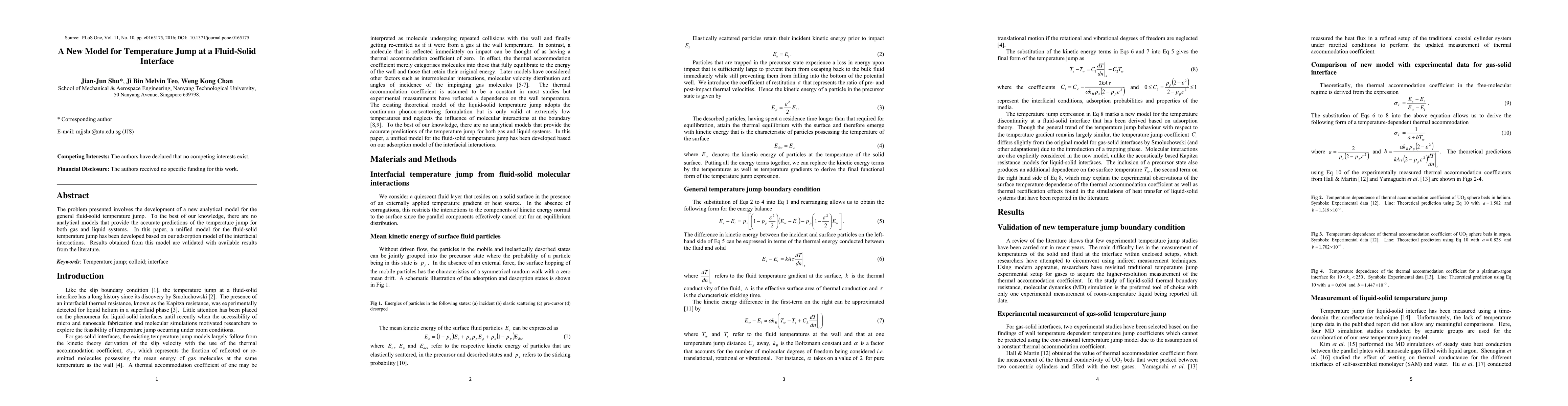 The problem presented involves the development of a new analytical model for the general fluid-solid temperature jump. To the best of our knowledge, there are no analytical models that provide the accurate predictions of the temperature jump for both gas and liquid systems. In this paper, a unified model for the fluid-solid temperature jump has been developed based on our adsorption model of the interfacial interactions. Results obtained from this model are validated with available results from the literature.