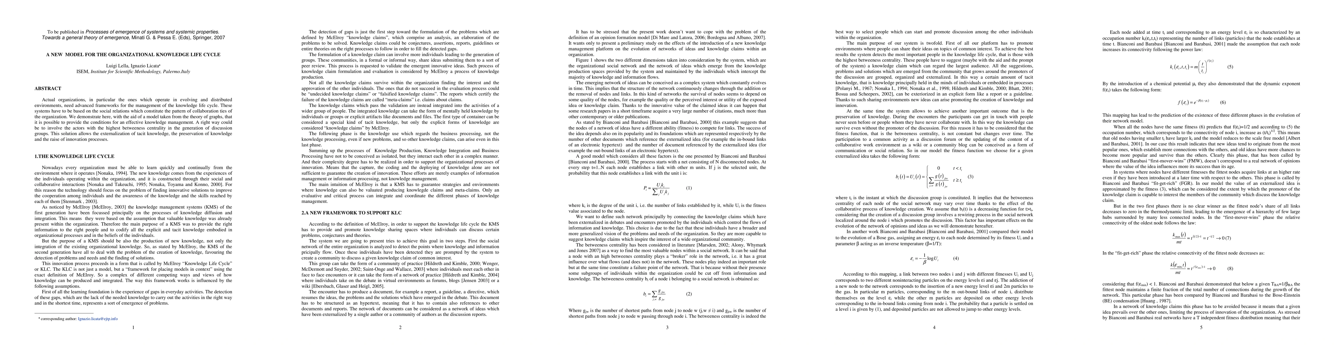 Actual organizations, in particular the ones which operate in evolving and distributed environments, need advanced frameworks for the management of the knowledge life cycle. These systems have to be based on the social relations which constitute the pattern of collaboration ties of the organization. We demonstrate here, with the aid of a model taken from the theory of graphs, that it is possible to provide the conditions for an effective knowledge management. A right way could be to involve the actors with the highest betweeness centrality in the generation of discussion groups. This solution allows the externalization of tacit knowledge, the preservation of knowledge and the raise of innovation processes.