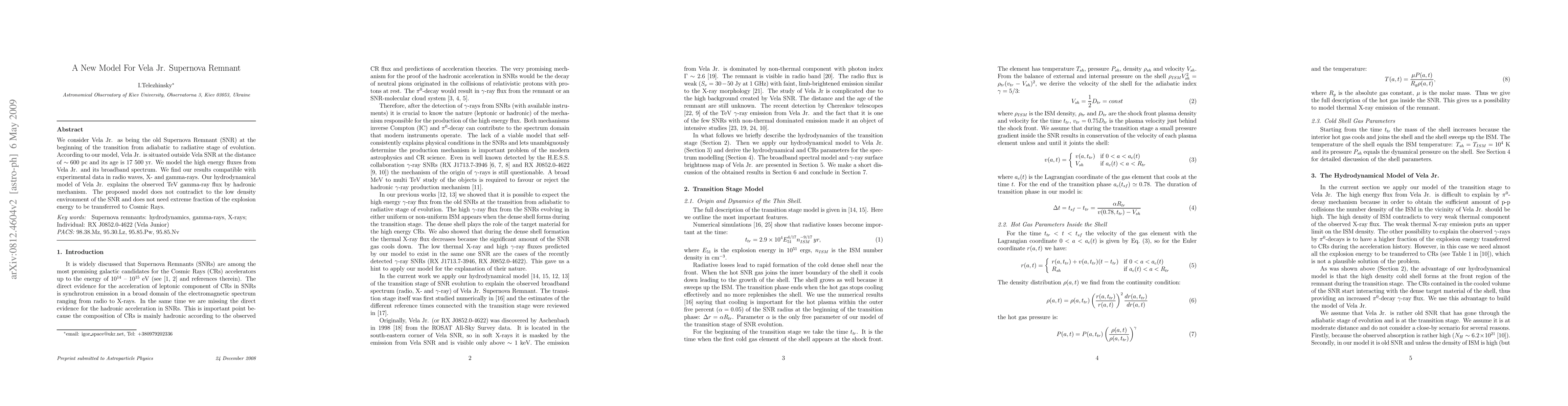 This paper proposes a new hydrodynamical model for the Vela Jr. Supernova Remnant, situating it at 600 pc and 17,500 years old, transitioning from adiabatic to radiative stages. The model explains high-energy fluxes and broadband spectrum, aligning with experimental data across radio, X-ray, and gamma-ray observations, and attributes the observed TeV gamma-ray flux to a hadronic mechanism.