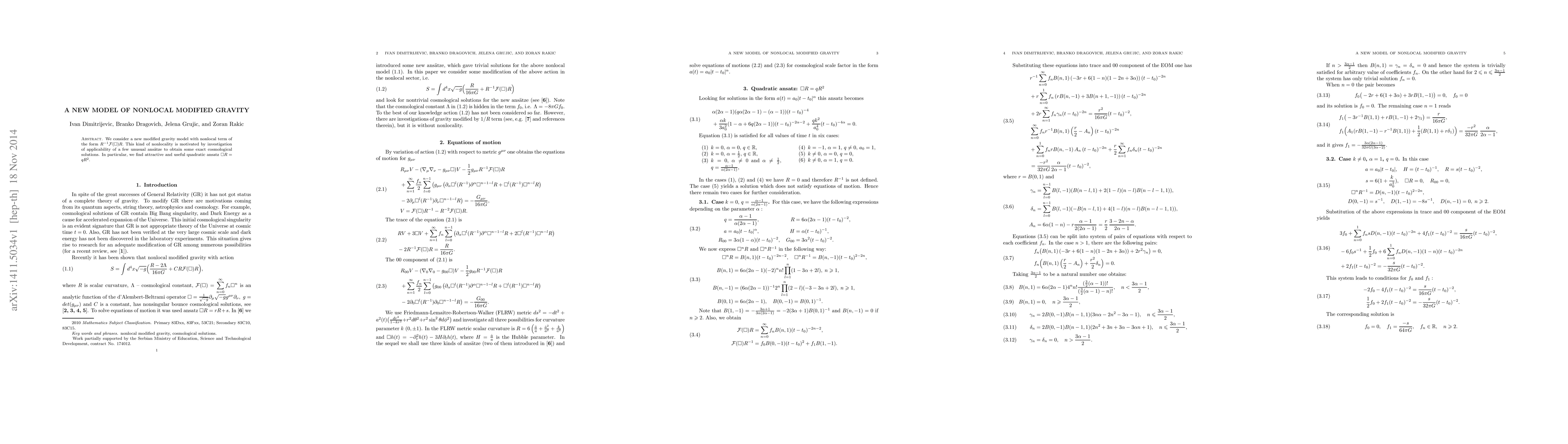 This paper proposes a new nonlocal modified gravity model incorporating a term $R^{-1} \mathcal{F}(\Box) R$ to explore exact cosmological solutions. The authors find a particularly useful quadratic ansatz $\Box R = q R^{2}$ for their model.