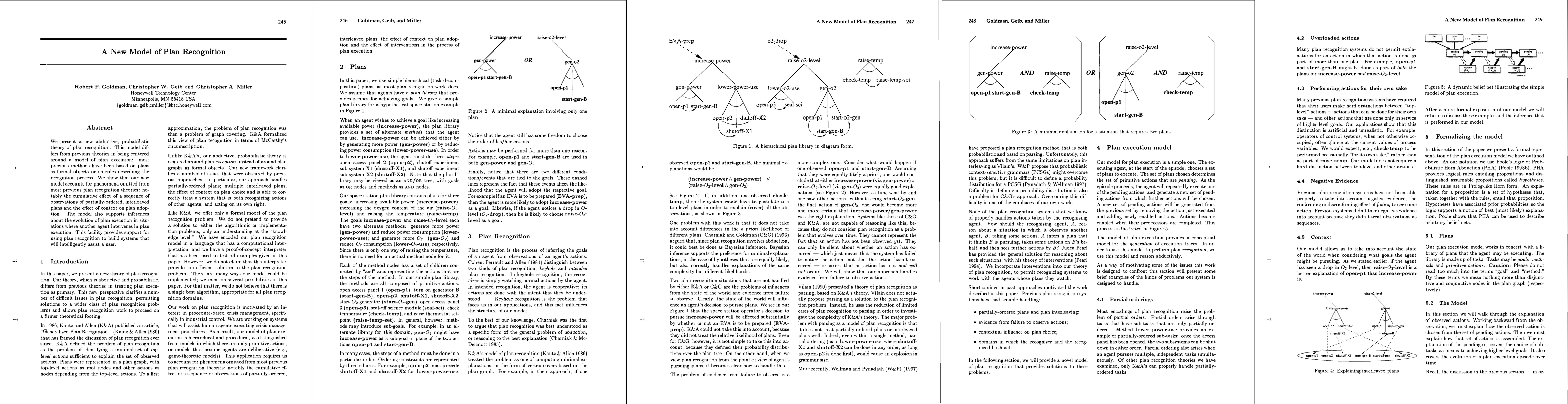 This paper introduces a novel abductive, probabilistic model for plan recognition that focuses on plan execution rather than formal plans or recognition rules. It effectively addresses overlooked aspects like the impact of sequence and context on plan adoption and supports inference in dynamic environments with agent interventions.