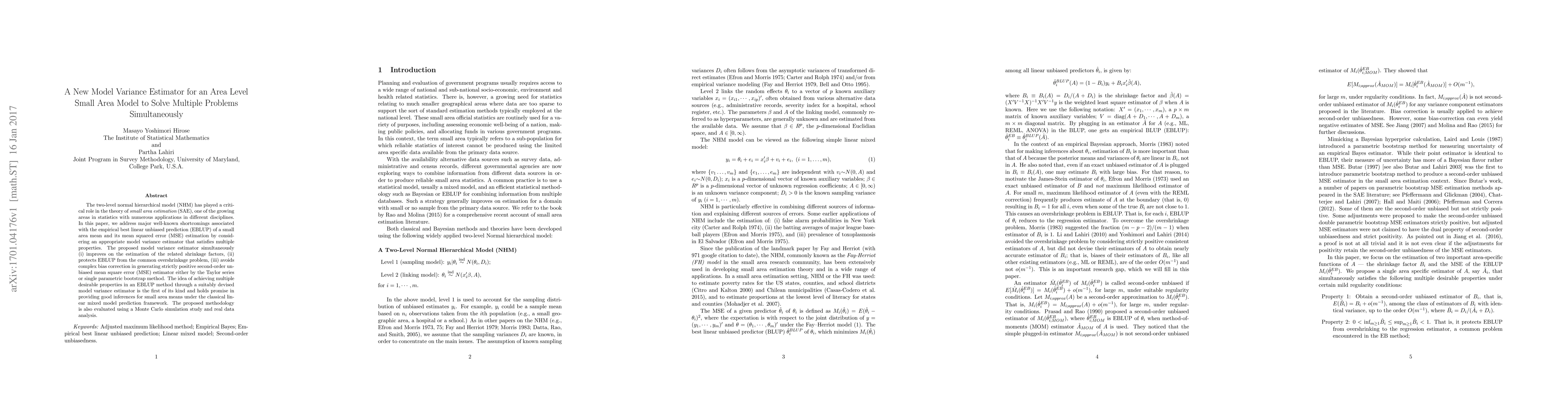 This paper proposes a new model variance estimator for a two-level normal hierarchical model to improve small area estimation, addressing issues like overshrinkage and bias correction. The new estimator aims to enhance shrinkage factor estimation and provide better inferences for small area means.