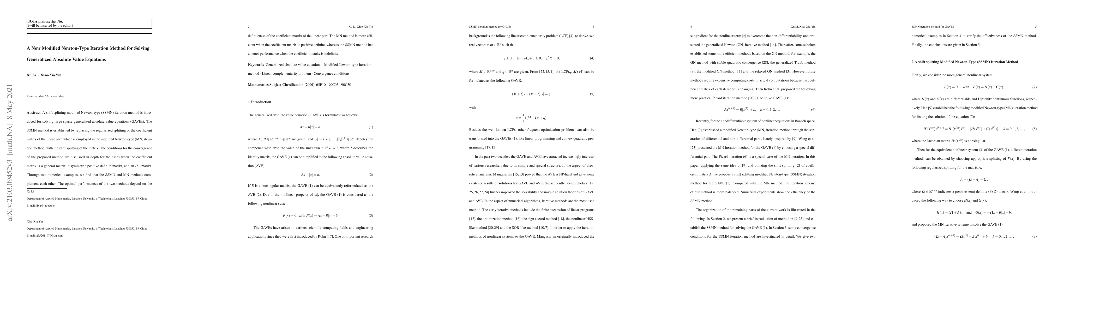 This paper introduces a new shift splitting modified Newton-type (SSMN) iteration method for solving large sparse generalized absolute value equations (GAVEs). It discusses convergence conditions for different types of coefficient matrices and finds that the SSMN method outperforms when the matrix is indefinite, while the modified Newton-type (MN) method is more efficient for positive definite matrices.