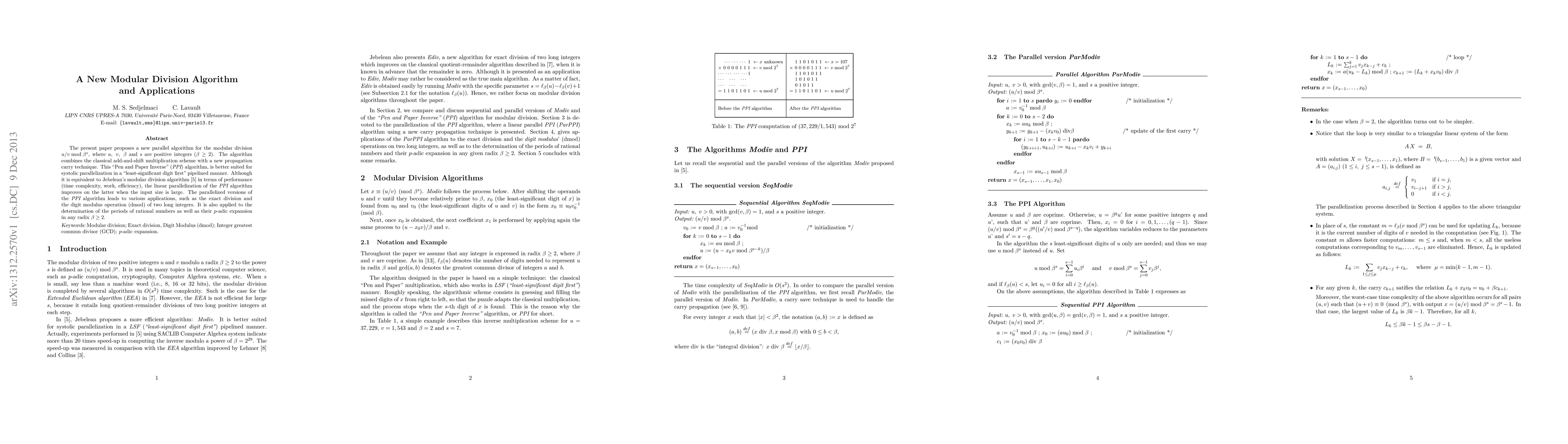 The present paper proposes a new parallel algorithm for the modular division $u/v\bmod \beta^s$, where $u,\; v,\; \beta$ and $s$ are positive integers $(\beta\ge 2)$. The algorithm combines the classical add-and-shift multiplication scheme with a new propagation carry technique. This "Pen and Paper Inverse" ({\em PPI}) algorithm, is better suited for systolic parallelization in a "least-significant digit first" pipelined manner. Although it is equivalent to Jebelean's modular division algorithm~\cite{jeb2} in terms of performance (time complexity, work, efficiency), the linear parallelization of the {\em PPI} algorithm improves on the latter when the input size is large. The parallelized versions of the {\em PPI} algorithm leads to various applications, such as the exact division and the digit modulus operation (dmod) of two long integers. It is also applied to the determination of the periods of rational numbers as well as their $p$-adic expansion in any radix $\beta \ge 2$.