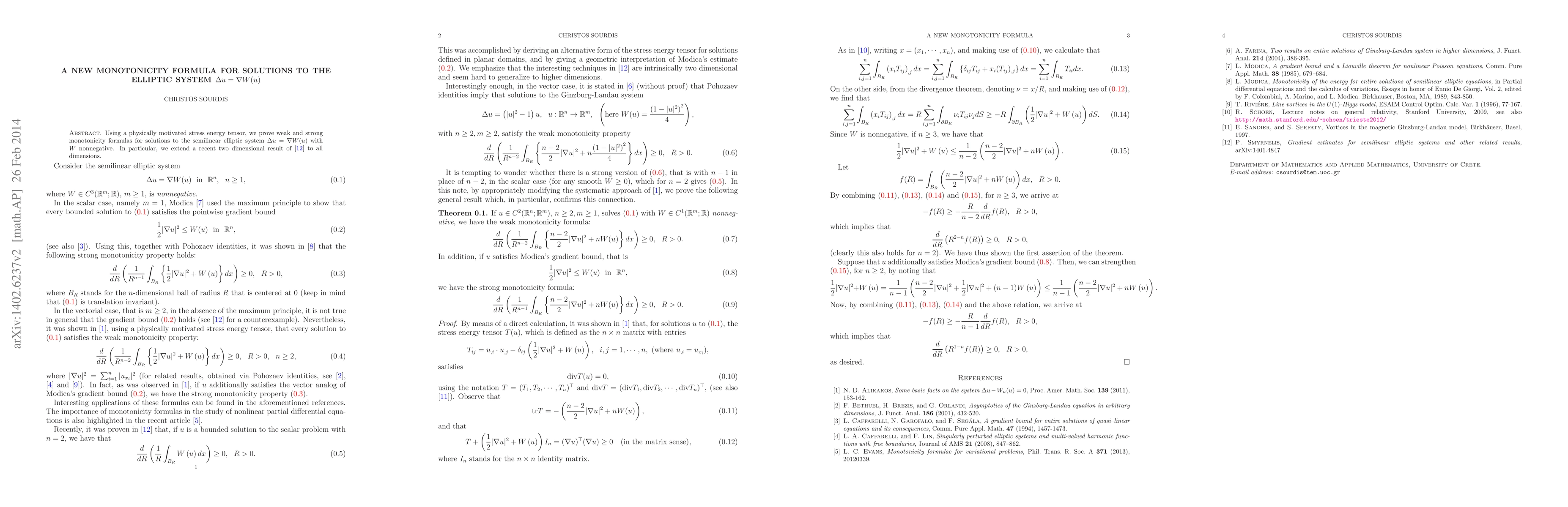 The paper proves weak and strong monotonicity formulas for solutions to the semilinear elliptic system ψ u=α W(u) with nonnegative W, extending a 2D result to all dimensions.