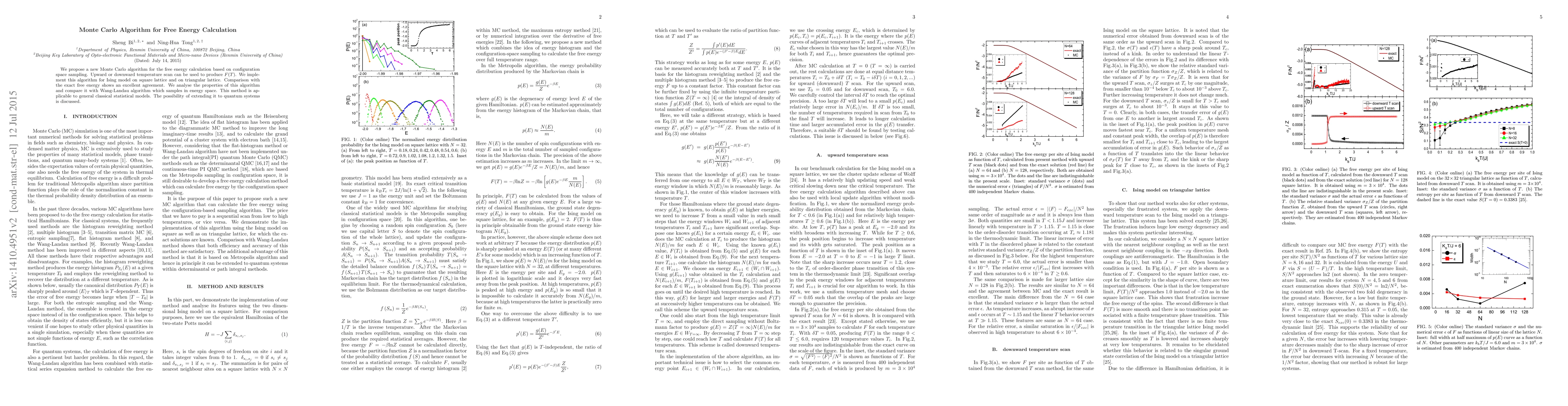 This paper introduces a novel Monte Carlo algorithm for calculating free energy through configuration space sampling, successfully applied to the Ising model, showing strong agreement with exact free energy values. It compares this method with the Wang-Landau algorithm and discusses its potential extension to quantum systems.