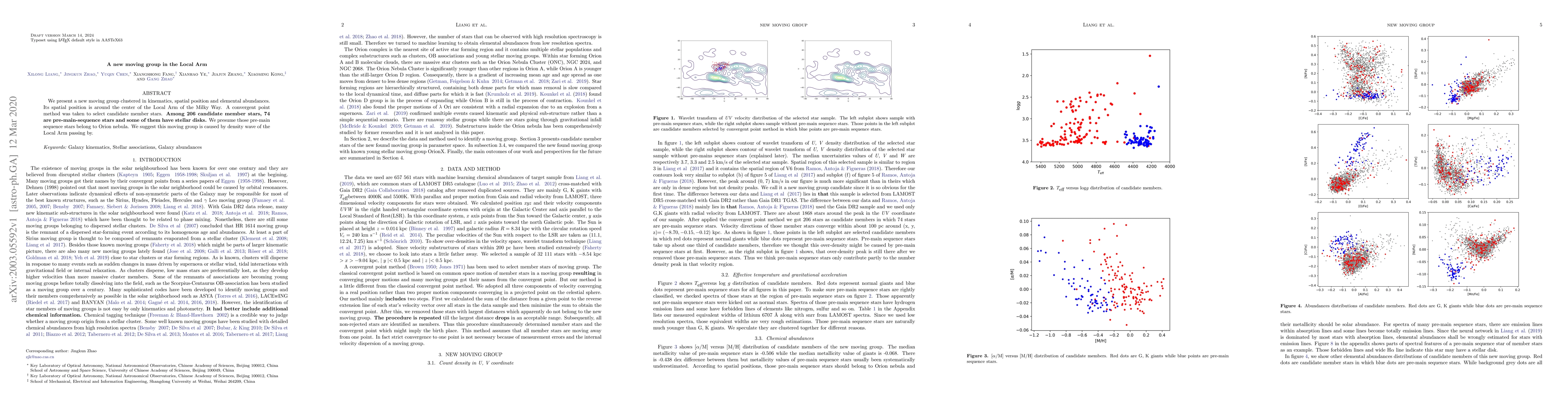 We present a new moving group clustered in kinematics, spatial position and elemental abundances. Its spatial position is around the center of the Local Arm of the Milky Way. A convergent point method was taken to select candidate member stars.\textbf{ Among 206 candidate member stars, 74 are pre-main-sequence stars and some of them have stellar disks.} We presume those pre-main sequence stars belong to Orion nebula. We suggest this moving group is caused by density wave of the Local Arm passing by.