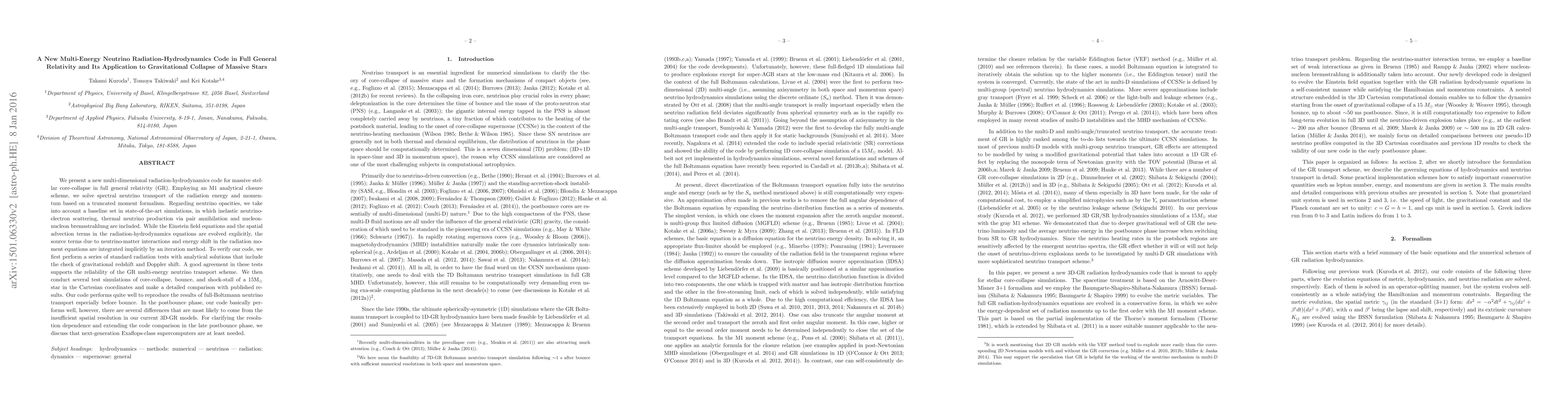 This paper introduces a new multi-energy neutrino radiation-hydrodynamics code in full general relativity for massive stellar core-collapse, employing an M1 closure scheme and solving spectral neutrino transport. The code performs well in reproducing full-Boltzmann neutrino transport results, though differences in the postbounce phase suggest the need for higher spatial resolution and next-generation supercomputers for further validation.