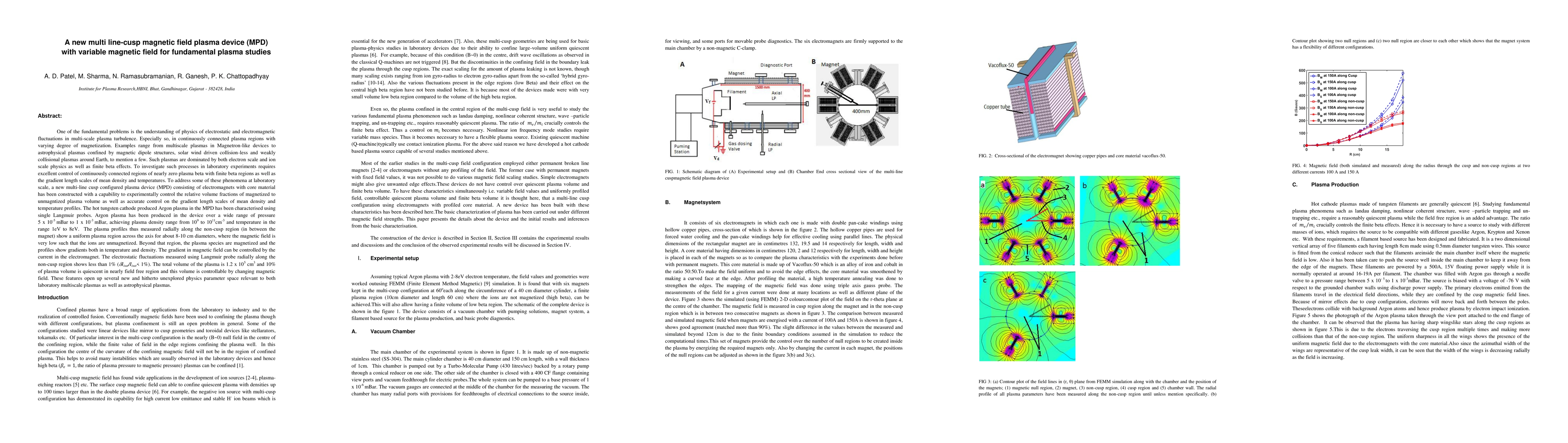One of the fundamental problems is the understanding of physics of electrostatic and electromagnetic fluctuations in multi-scale plasma turbulence. Especially so, in continuously connected plasma regions with varying degree of magnetization. Examples range from multiscale plasmas in Magnetron-like devices to astrophysical plasmas confined by magnetic dipole structures, solar wind driven collision-less and weakly collisional plasmas around Earth, to mention a few. Such plasmas are dominated by both electron scale and ion scale physics as well as finite beta effects. To investigate such processes in laboratory experiments requires excellent control of continuously connected regions of nearly zero plasma beta with finite beta regions as well as the gradient length scales of mean density and temperatures. To address some of these phenomena at laboratory scale, a new multi-line cusp configured plasma device (MPD) consisting of electromagnets with core material has been constructed with a capability to experimentally control the relative volume fractions of magnetized to unmagntized plasma volume as well as accurate control on the gradient length scales of mean density and temperature profiles. The hot tungsten cathode produced Argon plasma in the MPD has been characterised using single Langmuir probes. Argon plasma has been produced in the device over a wide range of pressure 5 x 10-5 mBar to 1 x 10-3 mBar, achieving plasma density range from 109 to 1011cm-3 and temperature in the range 1eV to 8eV.