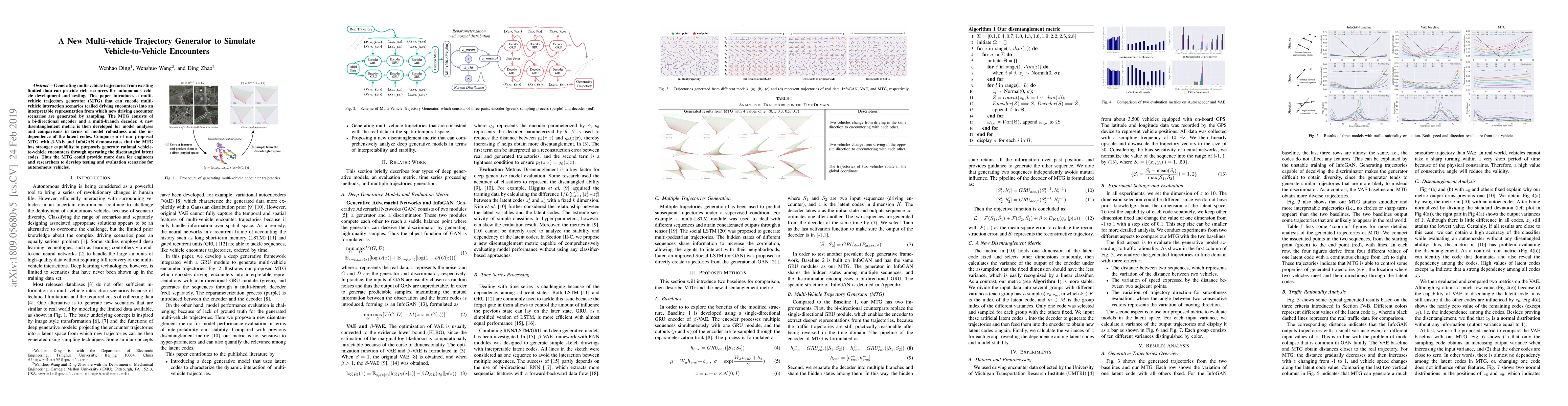 Generating multi-vehicle trajectories from existing limited data can provide rich resources for autonomous vehicle development and testing. This paper introduces a multi-vehicle trajectory generator (MTG) that can encode multi-vehicle interaction scenarios (called driving encounters) into an interpretable representation from which new driving encounter scenarios are generated by sampling. The MTG consists of a bi-directional encoder and a multi-branch decoder. A new disentanglement metric is then developed for model analyses and comparisons in terms of model robustness and the independence of the latent codes. Comparison of our proposed MTG with $\beta$-VAE and InfoGAN demonstrates that the MTG has stronger capability to purposely generate rational vehicle-to-vehicle encounters through operating the disentangled latent codes. Thus the MTG could provide more data for engineers and researchers to develop testing and evaluation scenarios for autonomous vehicles.