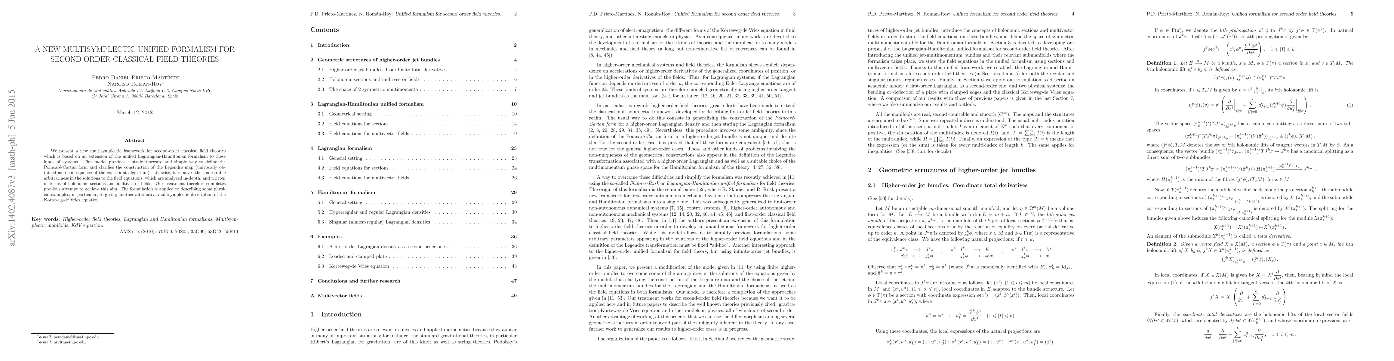 The paper introduces a new multisymplectic formalism for second-order classical field theories, extending the Lagrangian-Hamiltonian framework to clarify the construction of the Legendre map and remove solution arbitrariness. It applies this approach to physical examples, including an alternative multisymplectic description of the Korteweg-de Vries equation.