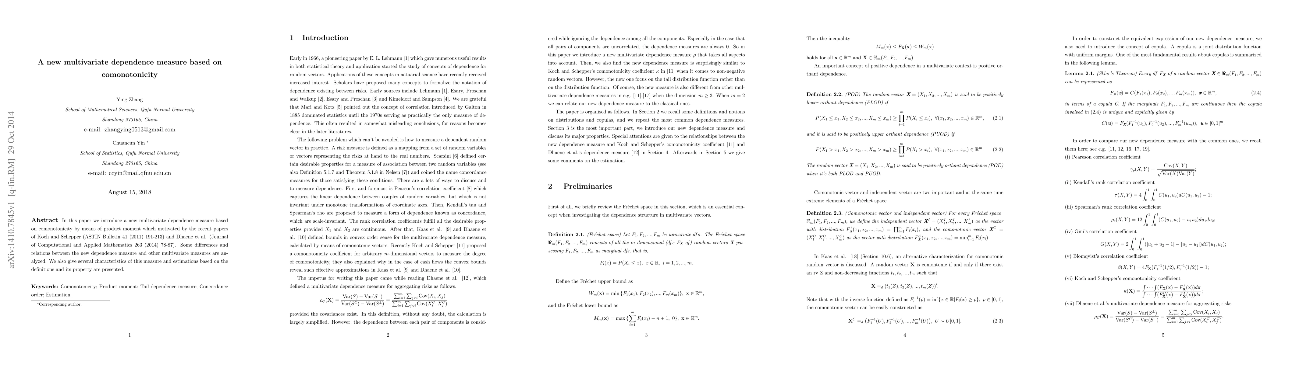 In this paper we introduce a new multivariate dependence measure based on comonotonicity by means of product moment which motivated by the recent papers of Koch and Schepper (ASTIN Bulletin 41 (2011) 191-213) and Dhaene et al. (Journal of Computational and Applied Mathematics 263 (2014) 78-87). Some differences and relations between the new dependence measure and other multivariate measures are an- alyzed. We also give several characteristics of this measure and estimations based on the definitions and its property are presented.
