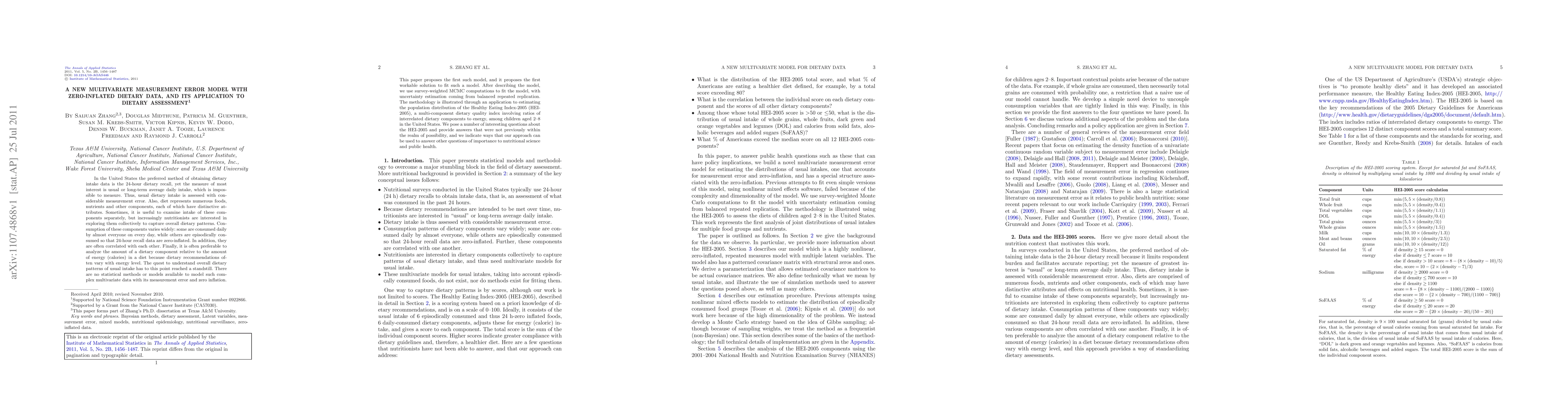 This paper introduces a new multivariate measurement error model for zero-inflated dietary data, addressing the complexities of usual dietary intake assessment. It proposes a solution for analyzing correlated dietary components and their relative energy intake, aiming to capture overall dietary patterns.
