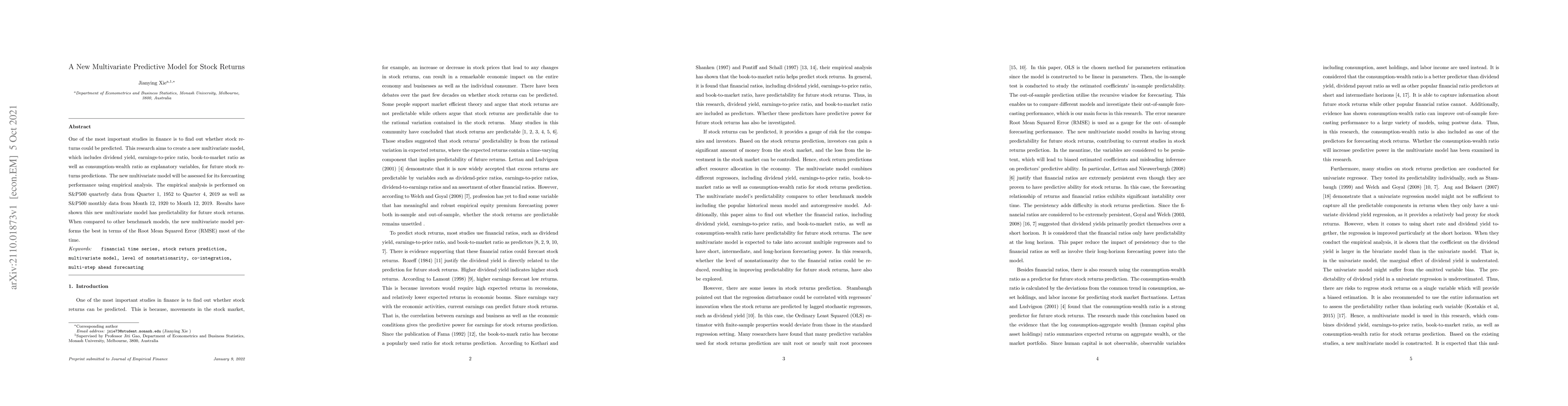 This research develops a new multivariate predictive model for stock returns using dividend yield, earnings-to-price ratio, book-to-market ratio, and consumption-wealth ratio. Empirical analysis on S&P500 data from 1920 to 2019 shows the model outperforms other benchmarks in forecasting accuracy, as indicated by lower RMSE.