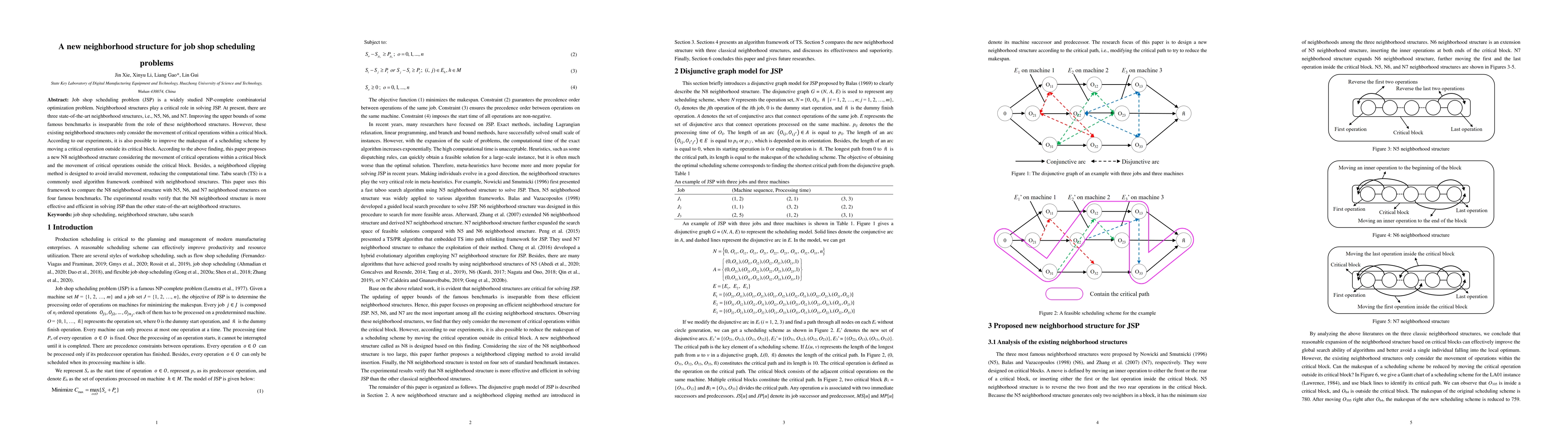 Job shop scheduling problem (JSP) is a widely studied NP-complete combinatorial optimization problem. Neighborhood structures play a critical role in solving JSP. At present, there are three state-of-the-art neighborhood structures, i.e., N5, N6, and N7. Improving the upper bounds of some famous benchmarks is inseparable from the role of these neighborhood structures. However, these existing neighborhood structures only consider the movement of critical operations within a critical block. According to our experiments, it is also possible to improve the makespan of a scheduling scheme by moving a critical operation outside its critical block. According to the above finding, this paper proposes a new N8 neighborhood structure considering the movement of critical operations within a critical block and the movement of critical operations outside the critical block. Besides, a neighborhood clipping method is designed to avoid invalid movement, reducing the computational time. Tabu search (TS) is a commonly used algorithm framework combined with neighborhood structures. This paper uses this framework to compare the N8 neighborhood structure with N5, N6, and N7 neighborhood structures on four famous benchmarks. The experimental results verify that the N8 neighborhood structure is more effective and efficient in solving JSP than the other state-of-the-art neighborhood structures.