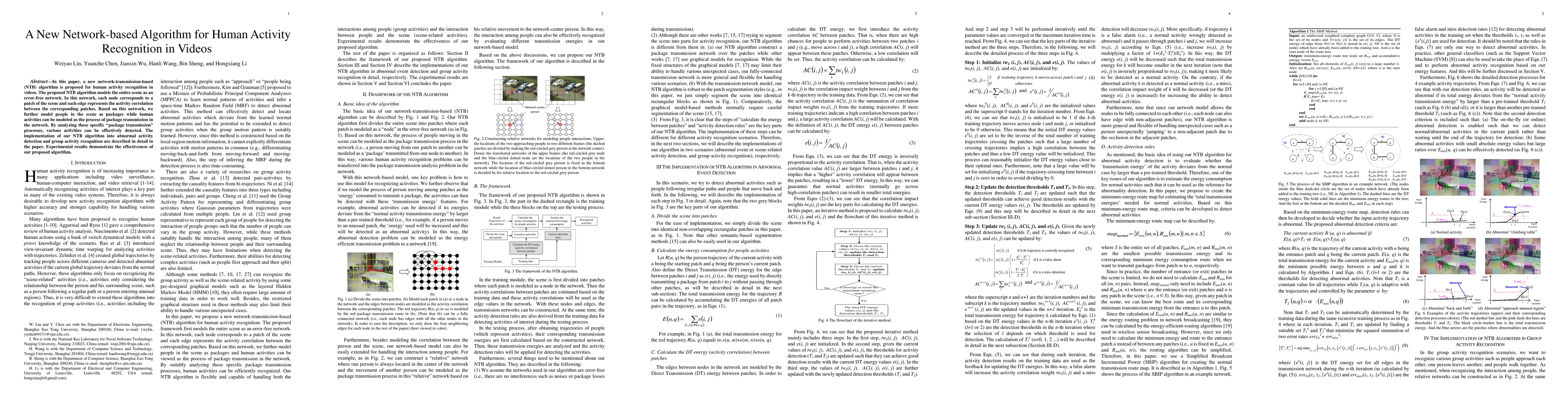 This paper proposes a novel network-transmission-based (NTB) algorithm for recognizing human activities in videos by modeling the scene as an error-free network where nodes represent scene patches and edges denote activity correlations. The algorithm detects activities by analyzing "package transmission" processes within this network, demonstrating effectiveness in abnormal and group activity detection.