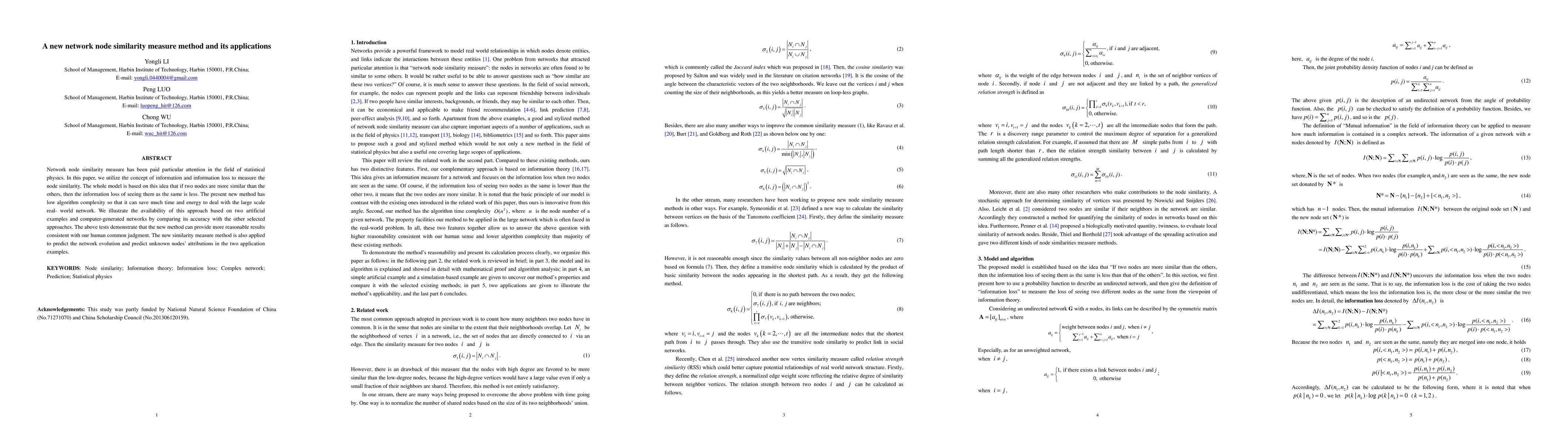 The paper introduces a new network node similarity measure method based on information theory, defining similarity through the concept of information loss, which offers a computationally efficient solution for large-scale networks.