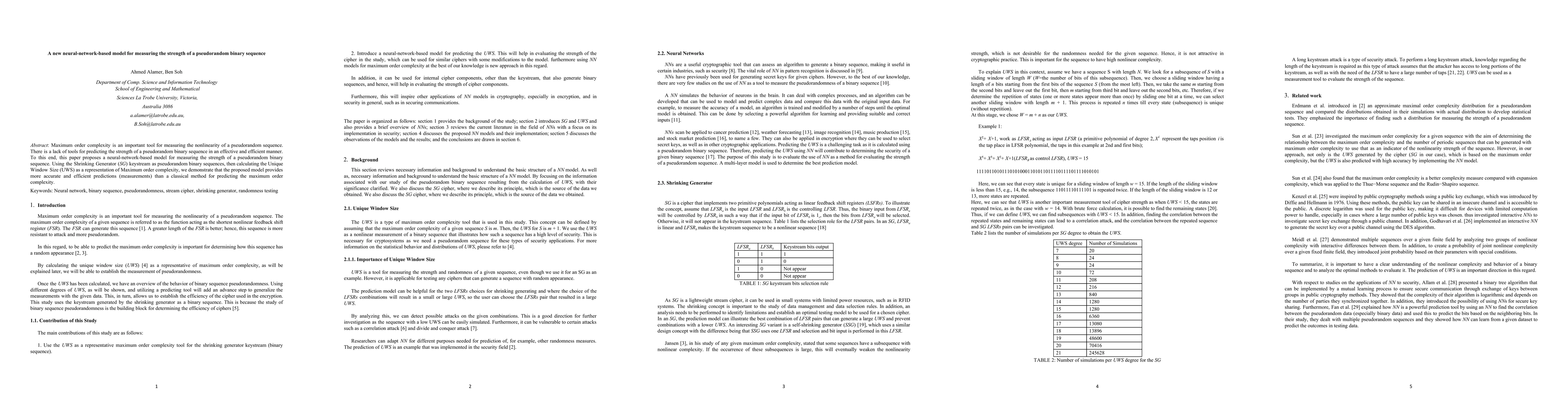 This paper proposes a neural-network-based model to measure the strength of pseudorandom binary sequences, demonstrating its accuracy and efficiency compared to classical methods by using the Shrinking Generator keystream and calculating the Unique Window Size.