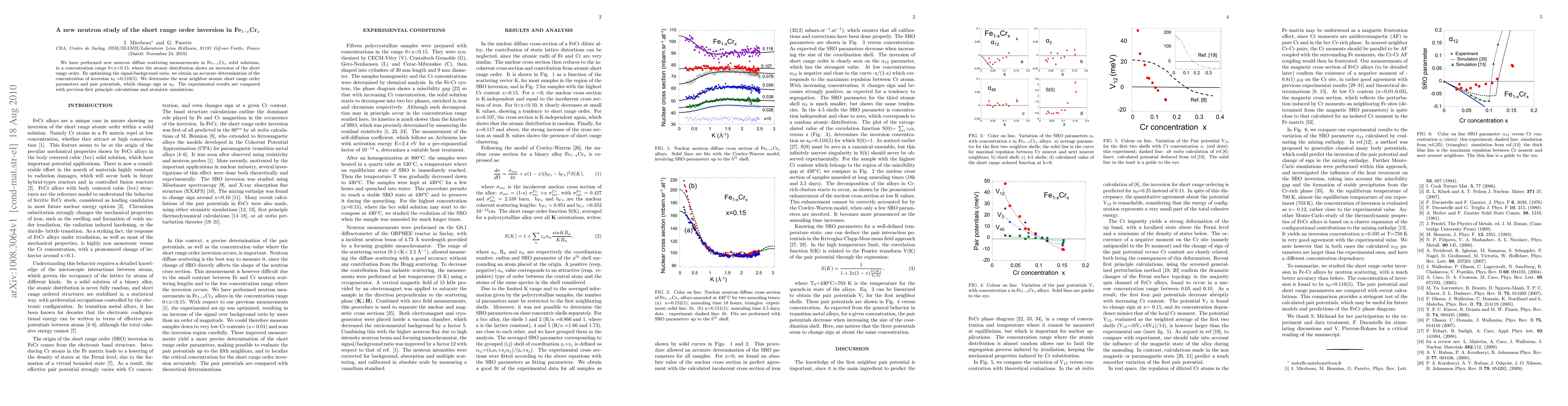 We have performed new neutron diffuse scattering measurements in Fe$_{1-x}$Cr$_x$ solid solutions, in a concentration range 0$<$x$<$0.15, where the atomic distribution shows an inversion of the short range order. By optimizing the signal-background ratio, we obtain an accurate determination of the concentration of inversion x$_0$ =0.110(5). We determine the near neighbor atomic short range order parameters and pair potentials, which change sign at x$_0$. The experimental results are compared with previous first principle calculations and atomistic simulations.
