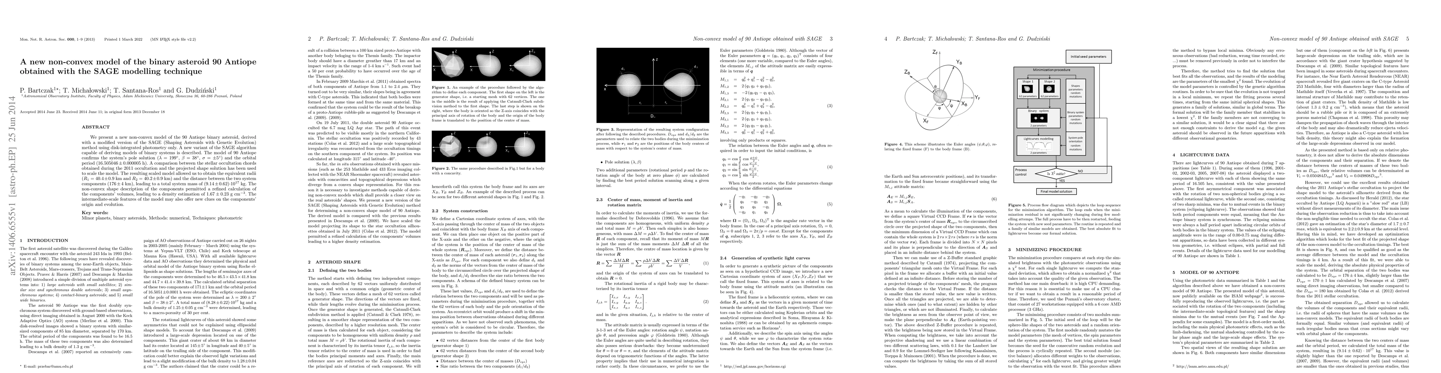 We present a new non-convex model of the 90 Antiope binary asteroid, derived with a modified version of the SAGE (Shaping Asteroids with Genetic Evolution) method using disk-integrated photometry only. A new variant of the SAGE algorithm capable of deriving models of binary systems is described. The model of 90 Antiope confirms the system's pole solution ($\lambda=199^{\circ}$, $\beta=38^{\circ}$, $\sigma=\pm5^{\circ}$) and the orbital period ($16.505046 \pm 0.000005$ h). A comparison between the stellar occultation chords obtained during the 2011 occultation and the projected shape solution has been used to scale the model. The resulting scaled model allowed us to obtain the equivalent radii ($R_{1}=40.4\pm0.9$ km and $R_{2}=40.2\pm0.9$ km) and the distance between the two system components ($176\pm4$ km), leading to a total system mass of ($9.14\pm0.62$)$\cdot10^{17}$ kg. The non-convex shape description of the components permitted a refined calculation of the components' volumes, leading to a density estimation of $1.67\pm0.23$ g cm$^{-3}$. The intermediate-scale features of the model may also offer new clues on the components' origin and evolution.