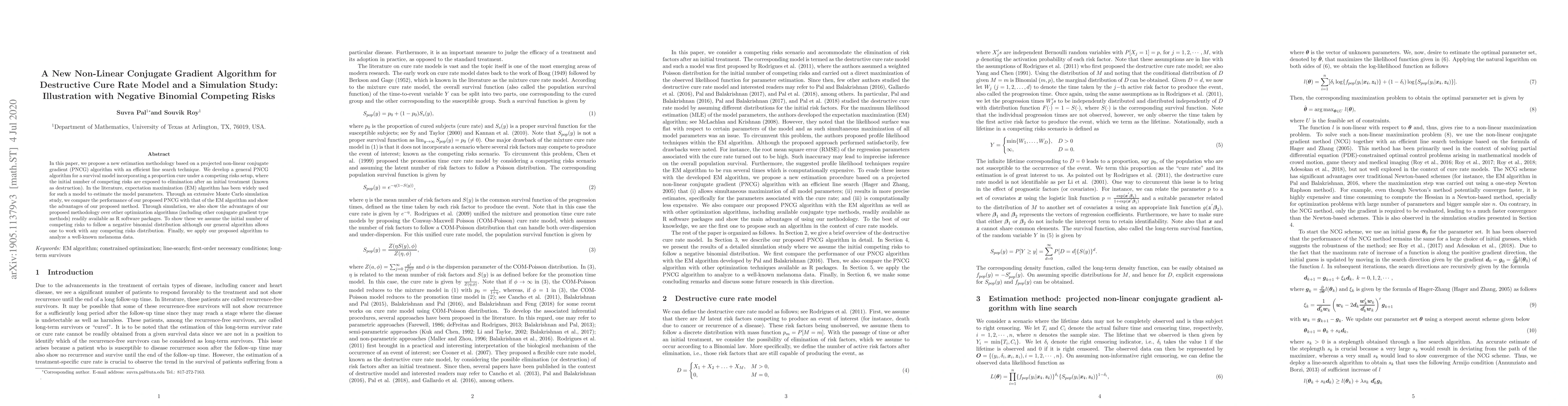 This paper proposes a new projected non-linear conjugate gradient (PNCG) algorithm for estimating parameters in a survival model with a cure rate under a competing risks framework. Through simulations and an application to melanoma data, the authors demonstrate the advantages of their method over the traditional EM algorithm and other optimization techniques.
