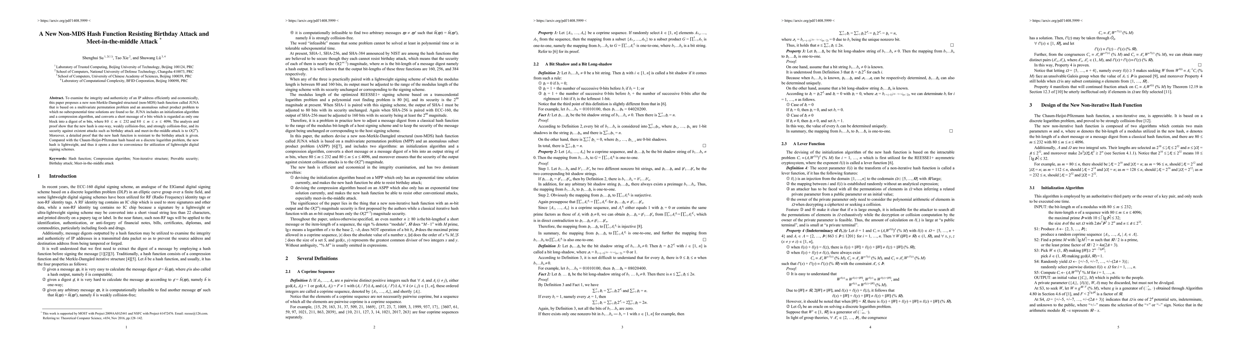 To examine the integrity and authenticity of an IP address efficiently and economically, this paper proposes a new non-Merkle-Damgard structural (non-MDS) hash function called JUNA that is based on a multivariate permutation problem and an anomalous subset product problem to which no subexponential time solutions are found so far. JUNA includes an initialization algorithm and a compression algorithm, and converts a short message of n bits which is regarded as only one block into a digest of m bits, where 80 <= m <= 232 and 80 <= m <= n <= 4096. The analysis and proof show that the new hash is one-way, weakly collision-free, and strongly collision-free, and its security against existent attacks such as birthday attack and meet-in-the- middle attack is to O(2 ^ m). Moreover, a detailed proof that the new hash function is resistant to the birthday attack is given. Compared with the Chaum-Heijst-Pfitzmann hash based on a discrete logarithm problem, the new hash is lightweight, and thus it opens a door to convenience for utilization of lightweight digital signing schemes.
