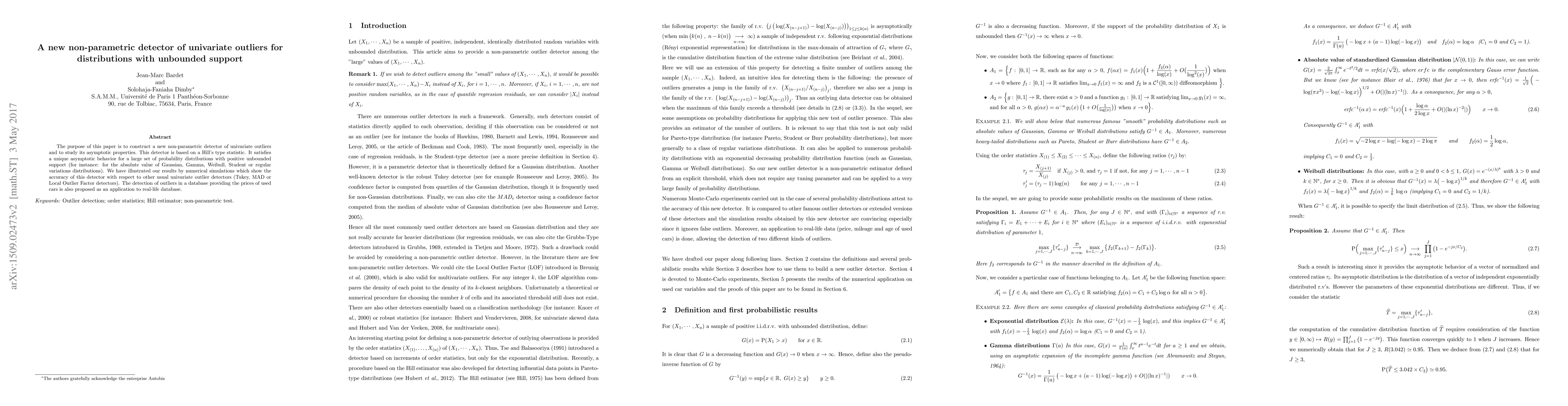 The purpose of this paper is to construct a new non-parametric detector of univariate outliers and to study its asymptotic properties. This detector is based on a Hill's type statistic. It satisfies a unique asymptotic behavior for a large set of probability distributions with positive unbounded support (for instance: for the absolute value of Gaussian, Gamma, Weibull, Student or regular variations distributions). We have illustrated our results by numerical simulations which show the accuracy of this detector with respect to other usual univariate outlier detectors (Tukey, MAD or Local Outlier Factor detectors). The detection of outliers in a database providing the prices of used cars is also proposed as an application to real-life database.